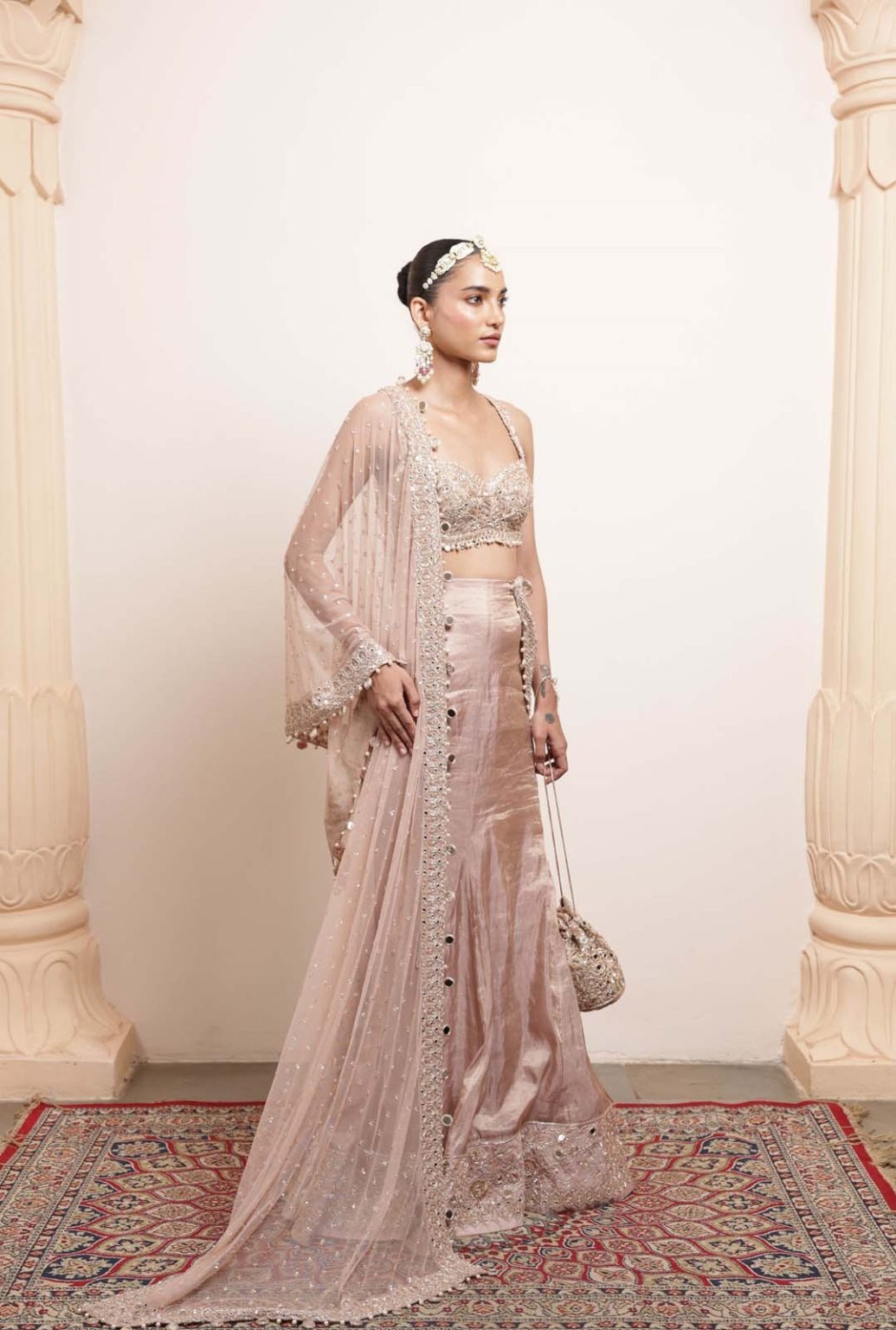 Rose-gold mirrors, cutdana, and kasab embroidery arranged in artistic patterns to create a regal and sophisticated appearance.
