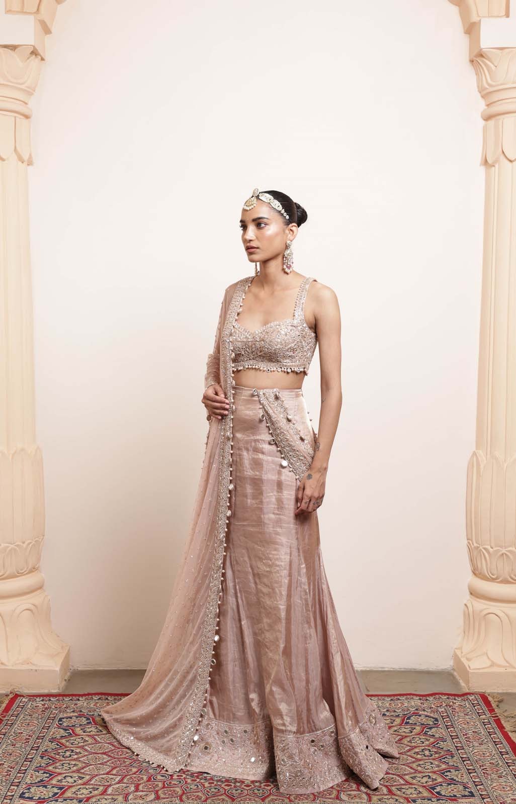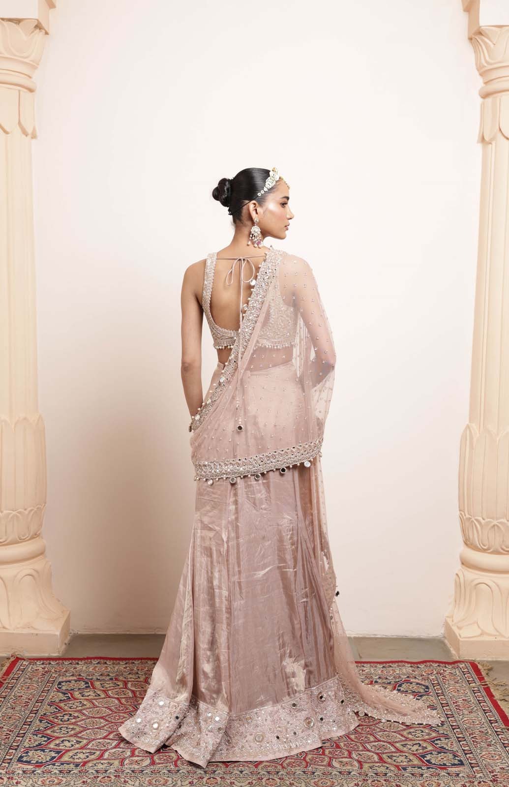 A luxurious rose gold sari and blouse ensemble crafted with refined hand embroidery, featuring mirror accents, cutdana artistry, and kasab detailing for an opulent formal look.