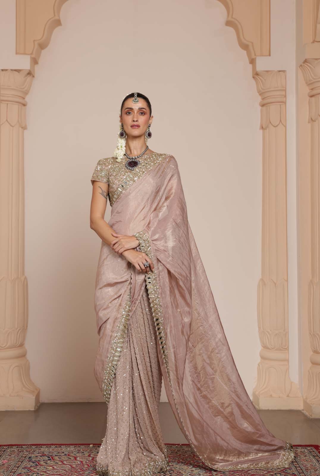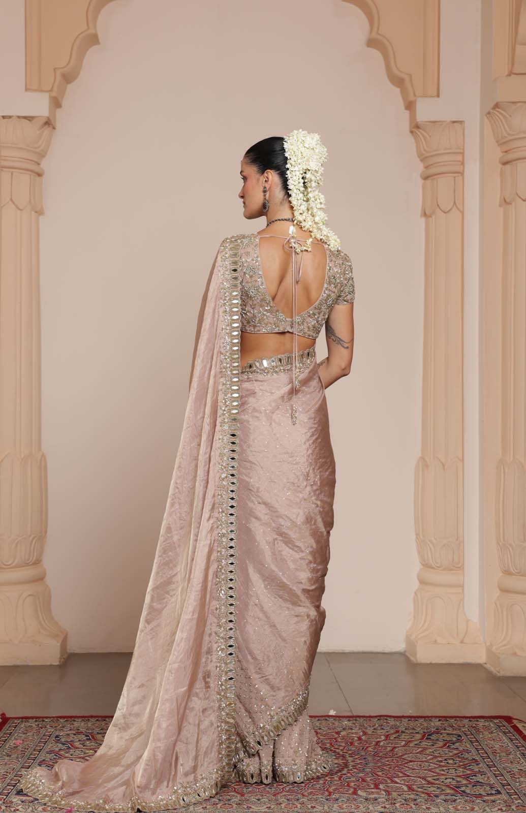 An elegant old-rose saree and blouse set featuring intricate tissue work with rose-gold mirror, cutdana, and kasab hand embroidery, perfect for weddings and festive occasions.