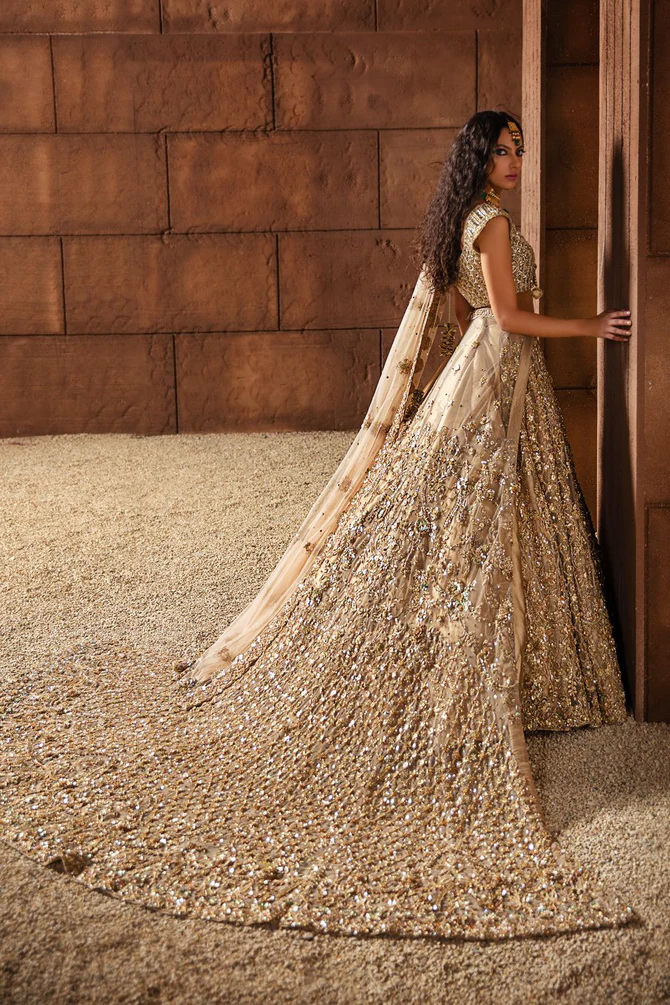 A luxurious champagne net bridal lehenga adorned with copper gold sequins, cut stones, and gotta stone detailing, featuring an extra-long tail for a regal and striking wedding look.
