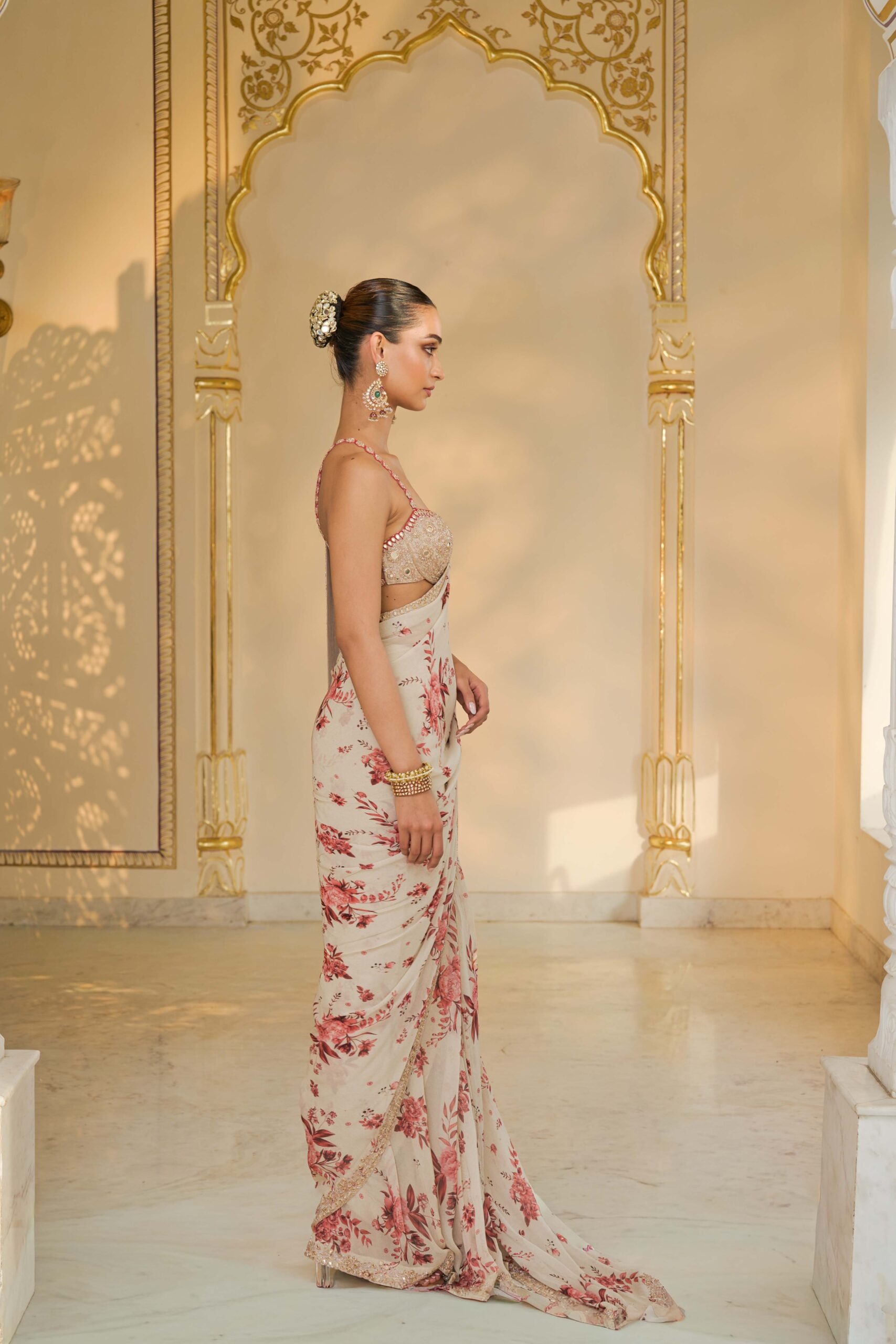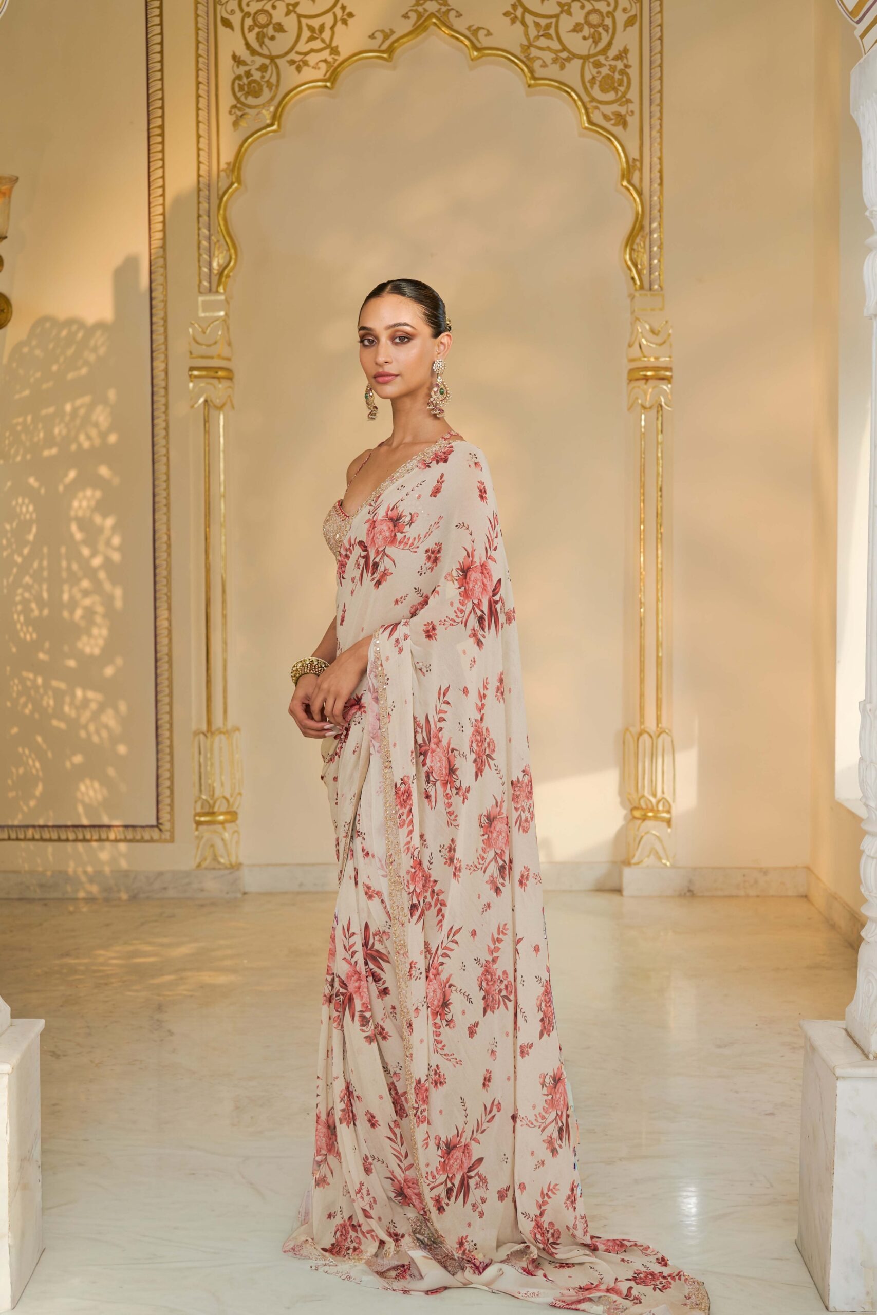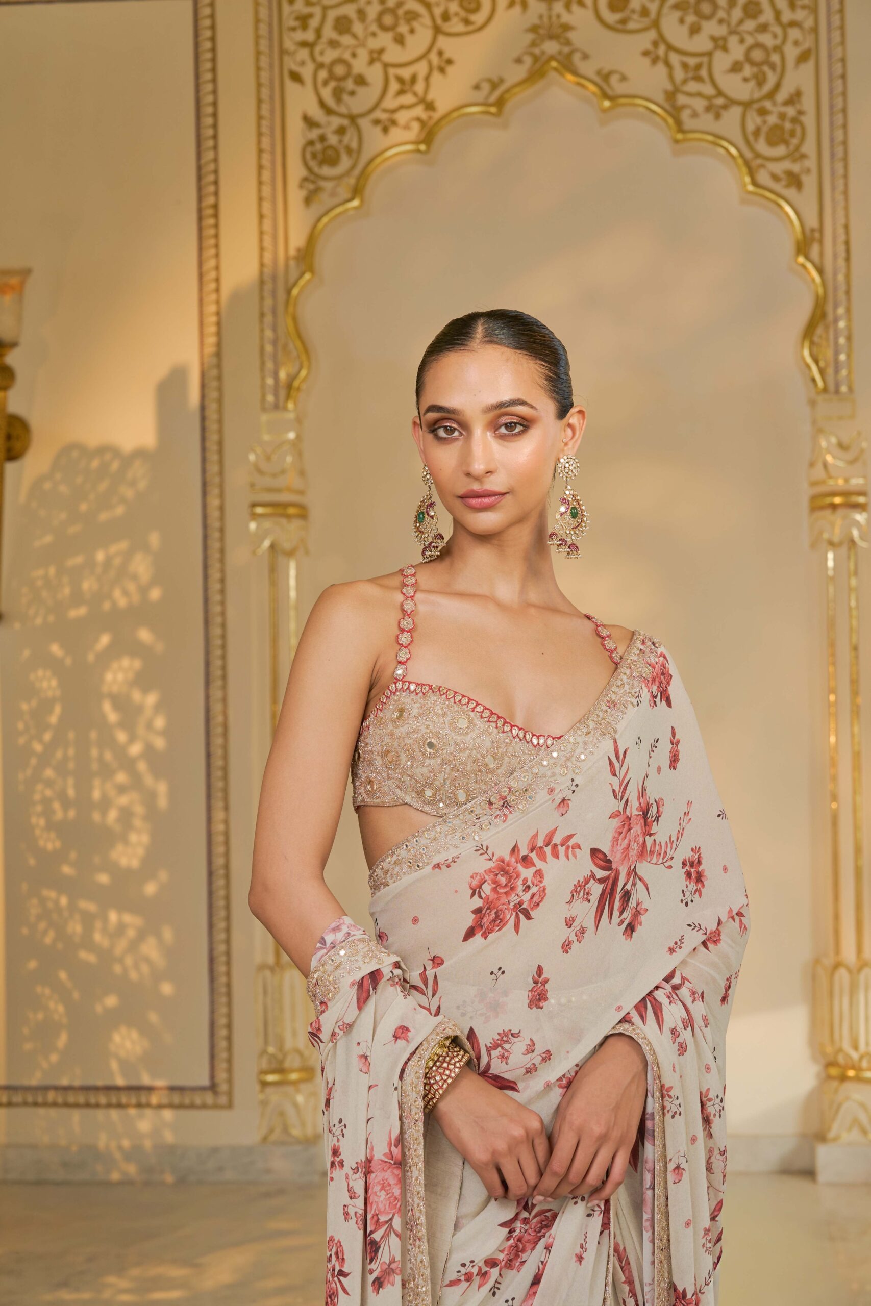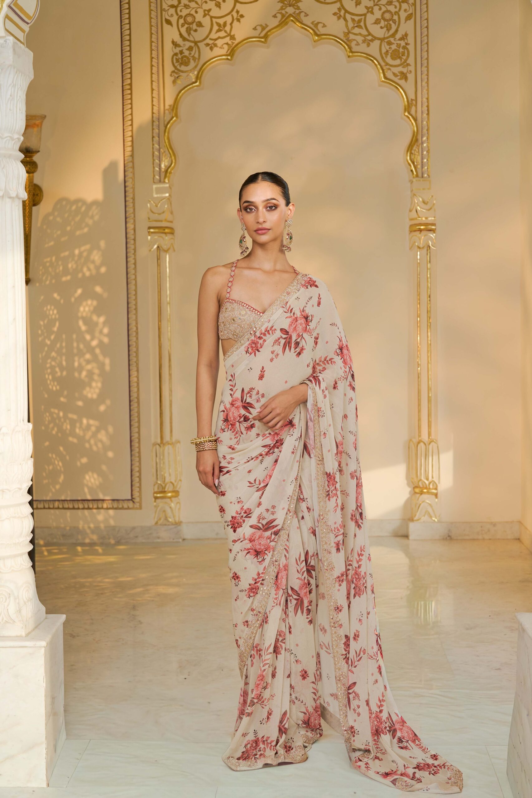 The sari is crafted from premium fabric with a vibrant red bloom print that offers both elegance and a graceful drape. Rose gold mirror and cutdana hand embroidery are thoughtfully placed throughout the fabric, adding shimmer and texture while maintaining a harmonious, refined look.