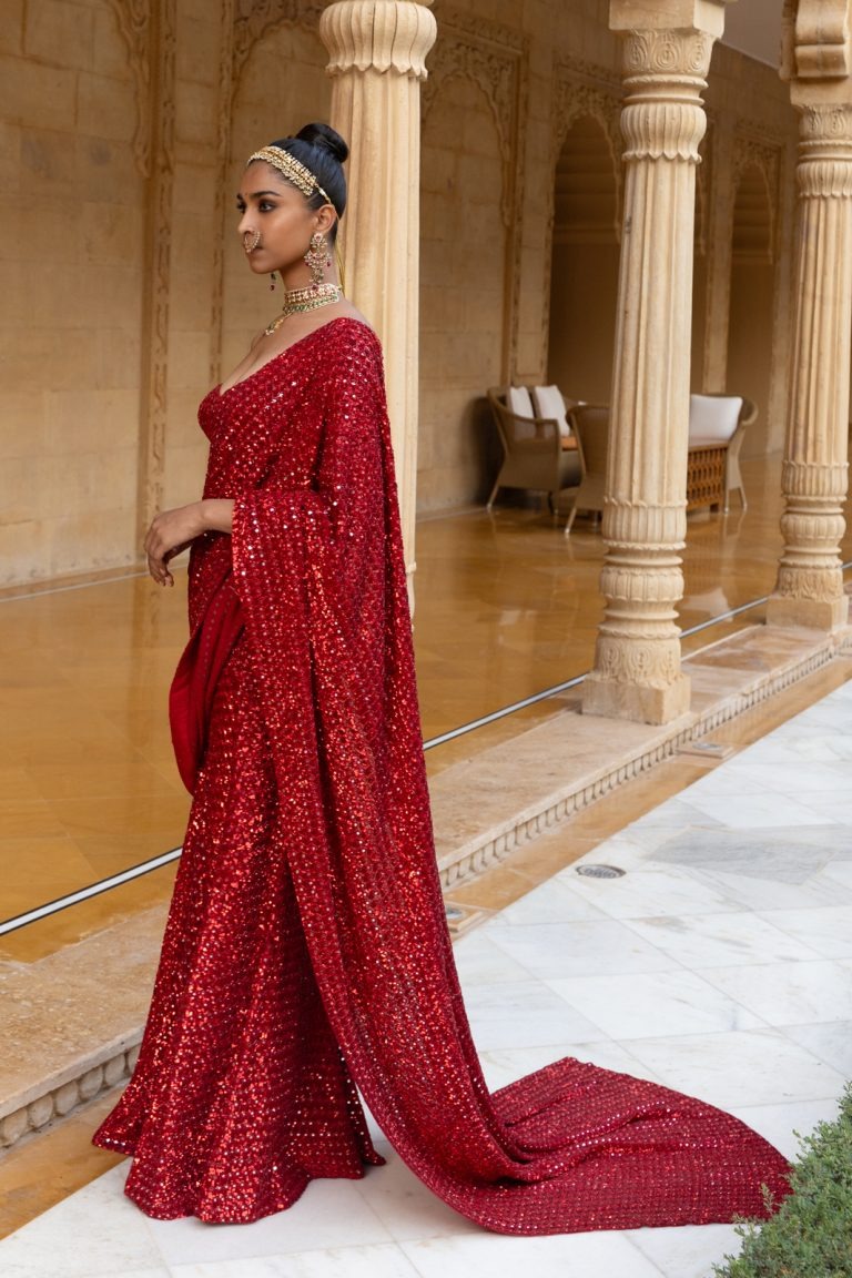 A fully hand-embellished red saree designed with striking sequin artistry and reflective mirror detailing, crafted to deliver an unforgettable bridal or formal statement.