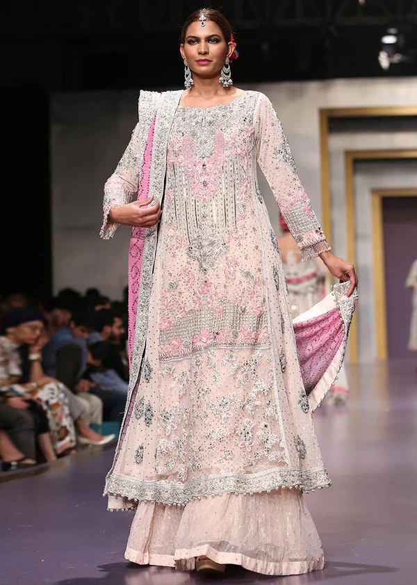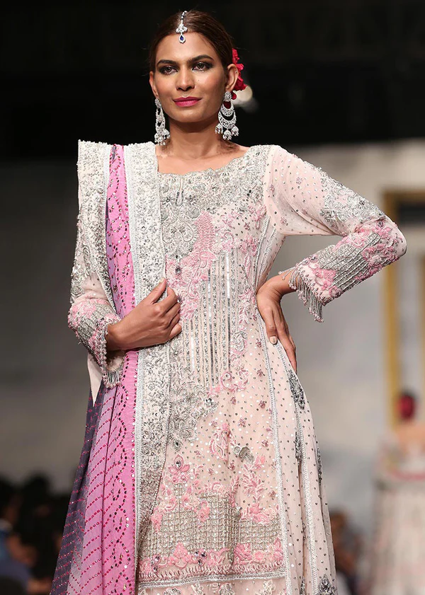 A graceful combination of dusty pink, pink, and grey tones crafted in fine net with silver kora, dabka, stones, and self-thread detailing, paired with a chundari dupatta and a shimmering lehenga for an ethereal bridal look.