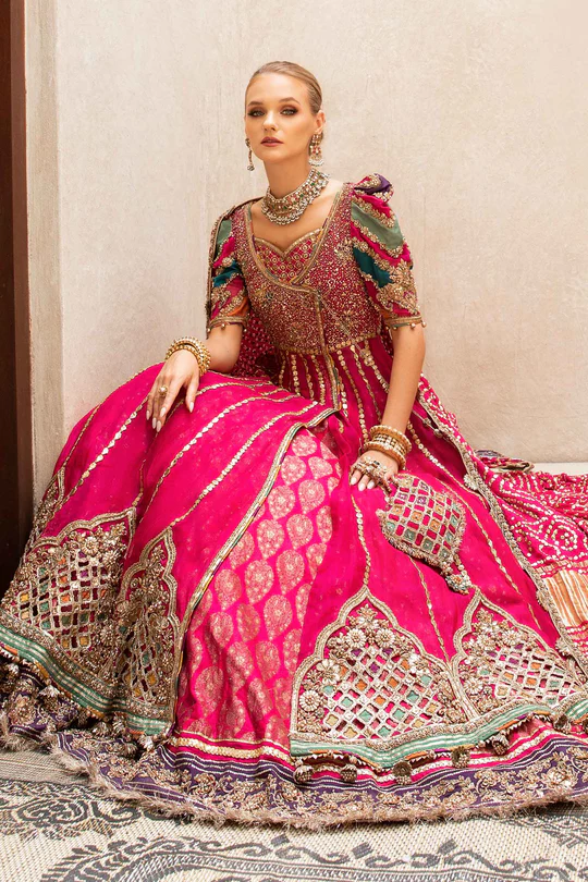 Hand-embellished organza angrakha with sequins, dabka, naqshi and gotta, flared jamawar lehenga with multi-color patchwork accents, gajji silk dupatta with heavy mukaish detailing, hot pink set for statement occasions, custom sizing available