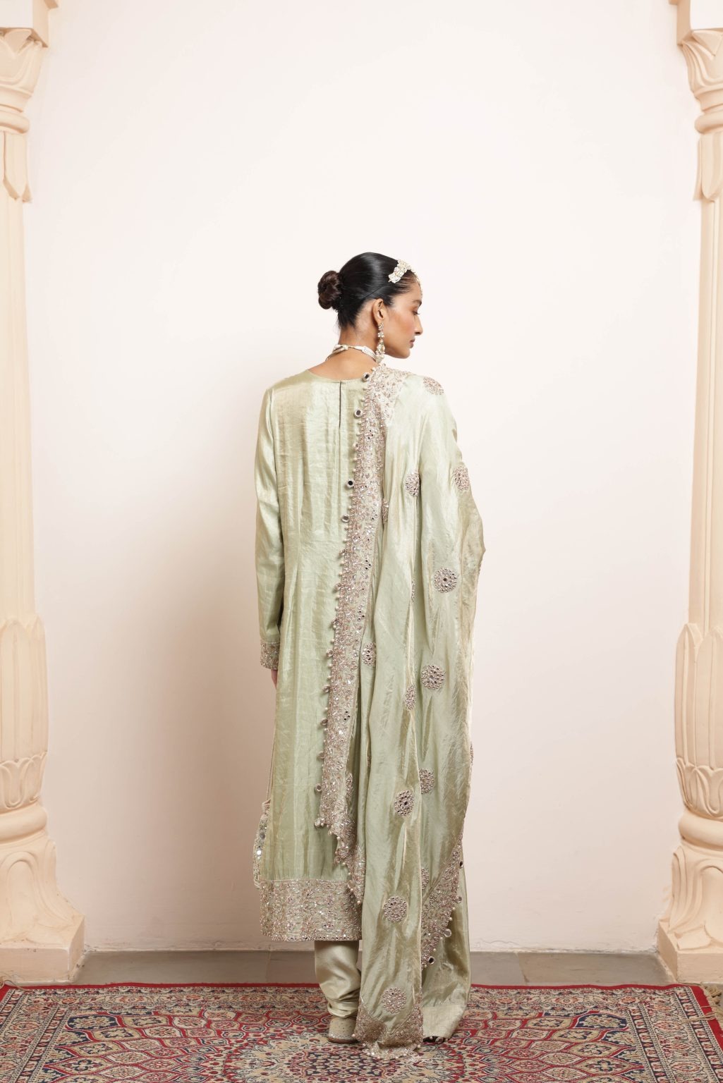 The kurta is crafted from premium tissue fabric in a soothing sea green hue. Intricate hand embroidery incorporates rose gold sequins, mirror accents, and cutdana detailing to create a delicate, shimmering effect. The long silhouette is designed to enhance elegance and grace for ceremonial occasions.