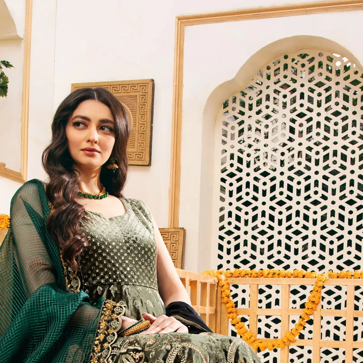 This regal bridal pishwas is crafted in a deep emerald green, celebrating traditional Pakistani bridal artistry with a modern, luxurious touch. The long-flowing frock is exquisitely adorned with intricate embroidery, fine threadwork, tilla, and Resham detailing. Hand-set stones and shimmering sequins add a radiant glow, giving the bride an enchanting presence at every wedding festivity. The rich embellishments are thoughtfully placed to enhance the silhouette and create an effortlessly majestic look.