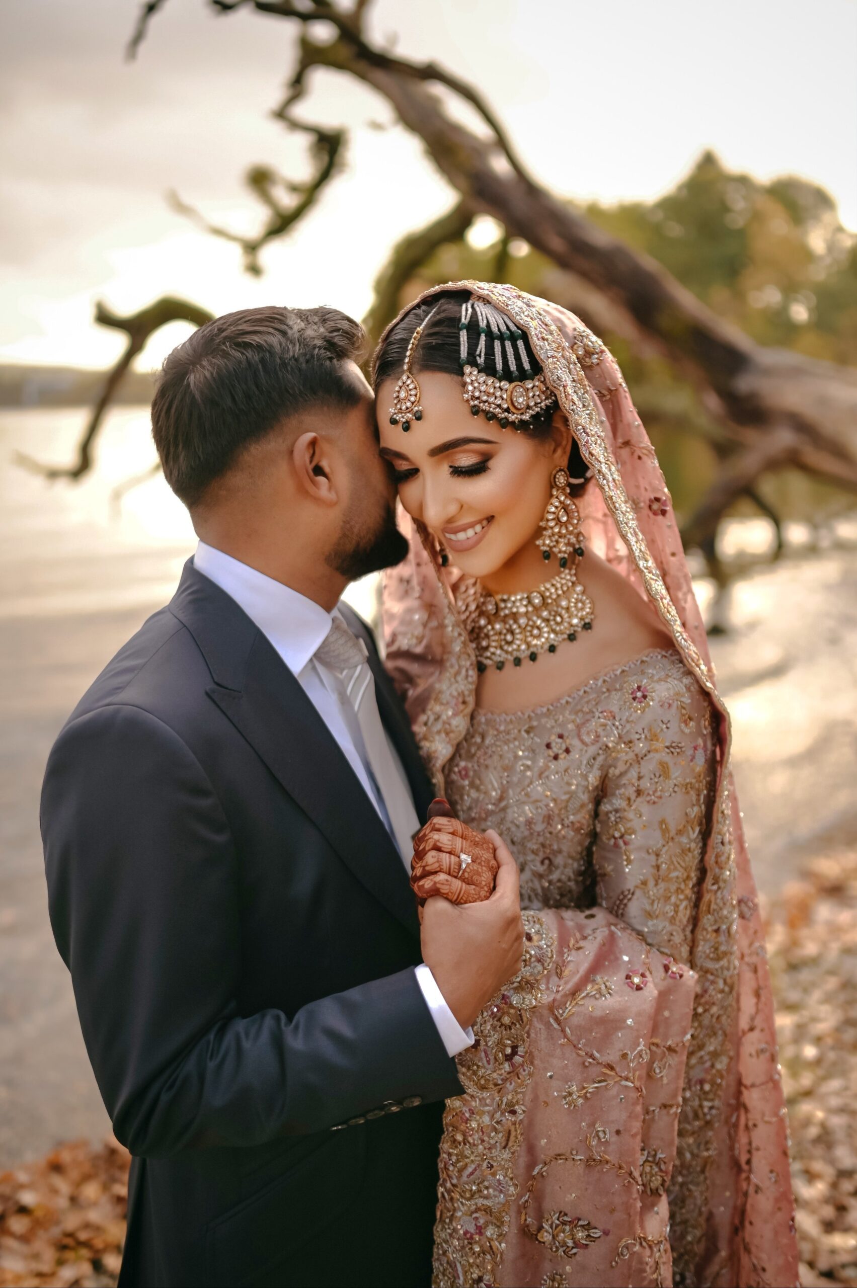 A majestic Pakistani bridal ensemble featuring a long, heavily embroidered dusty rose shirt paired with a voluminous, layered skirt/gharara in complementary blush tones, and a soft net dupatta finished with opulent gold work.