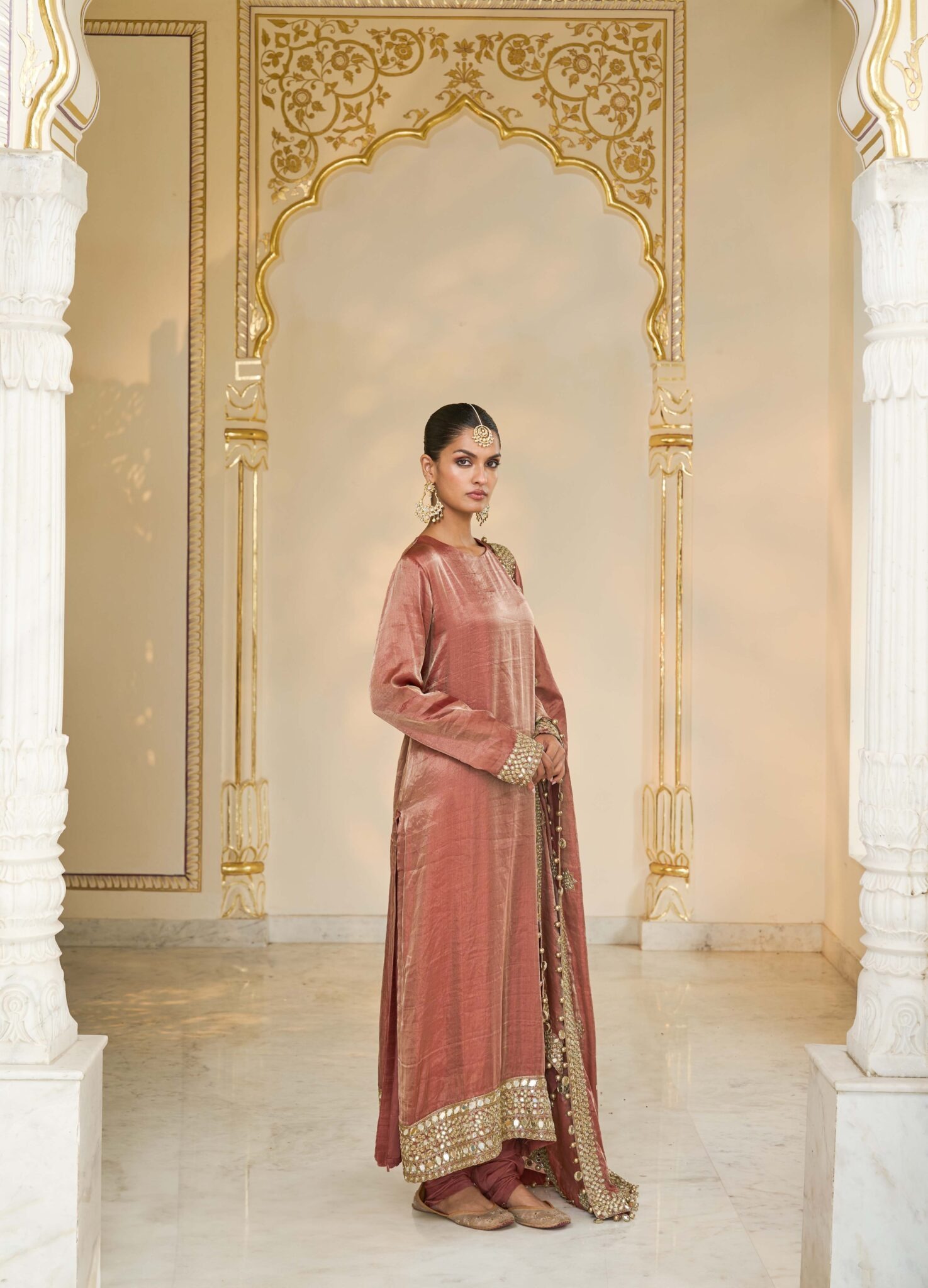 A delicately hand-embroidered tissue kurta paired with a classic churidar and a beautifully detailed dupatta, designed in graceful brick and beige-gold tones for timeless elegance.