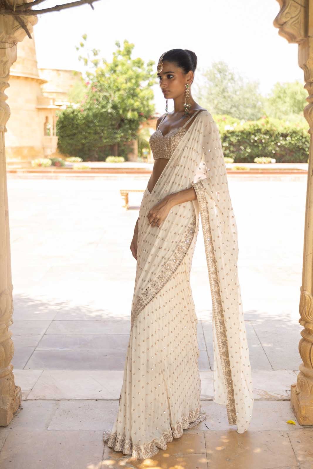 The sari is crafted in a serene coconut shade that offers a clean, refined canvas for intricate embellishment. Hand-embroidered detailing in rose-gold tones brings subtle radiance, while mirror accents add a touch of luminous charm. The smooth drape and elegant fall make it suitable for festive and formal occasions.