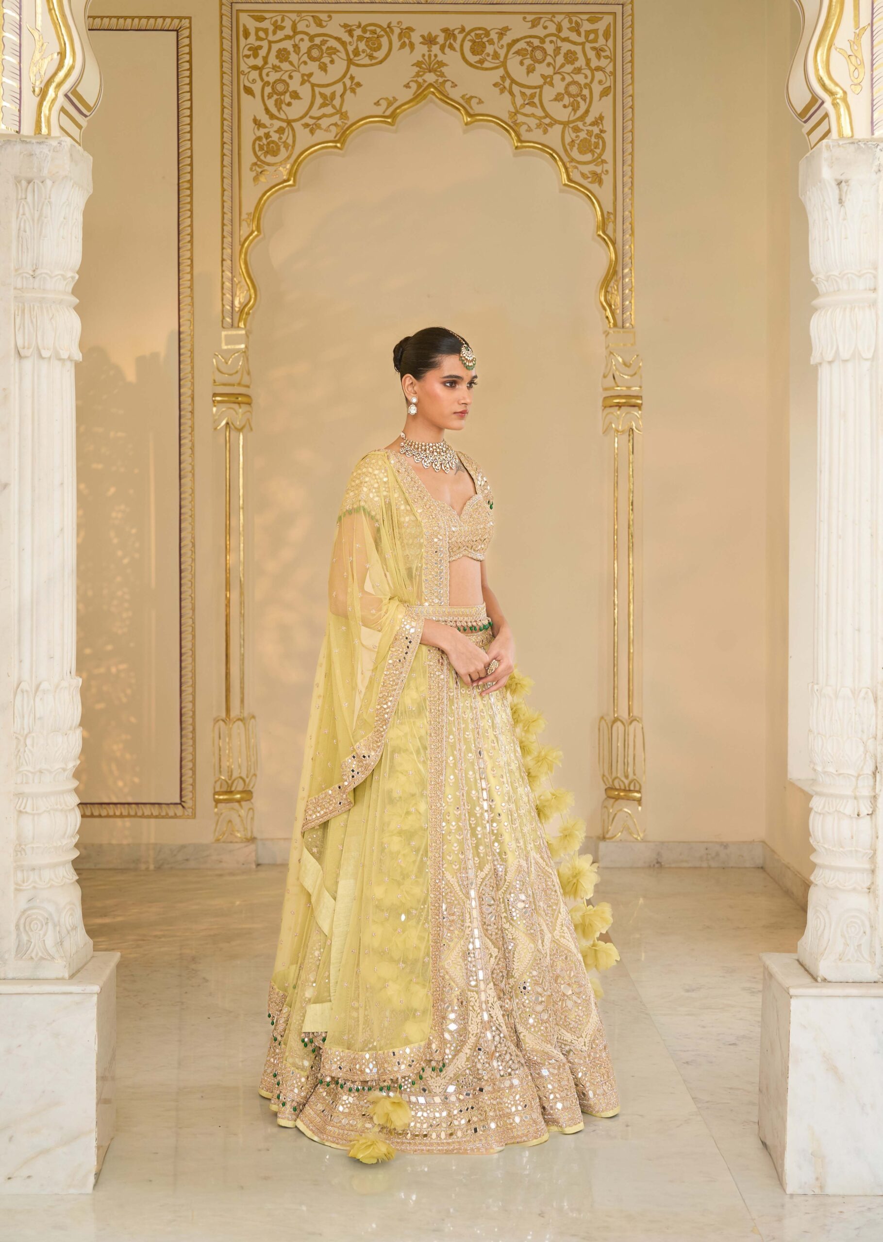 The lehenga flows beautifully with a generous flare that enhances movement and adds regal volume. Crafted from embroidered net, it showcases intricate handwork arranged to create a harmonious visual pattern. The piece is finished with handcrafted organza flower tassels, adding a soft, artistic touch to the overall design.