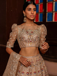 The organza lehenga complements the choli with its flowing structure and meticulous embroidery. Every panel is artfully embellished, showcasing fine craftsmanship and attention to detail. The soft organza fabric ensures graceful movement, while the elegant flare and structure of the lehenga provide a regal and timeless bridal silhouette.