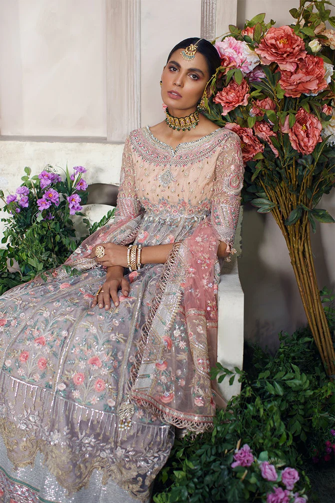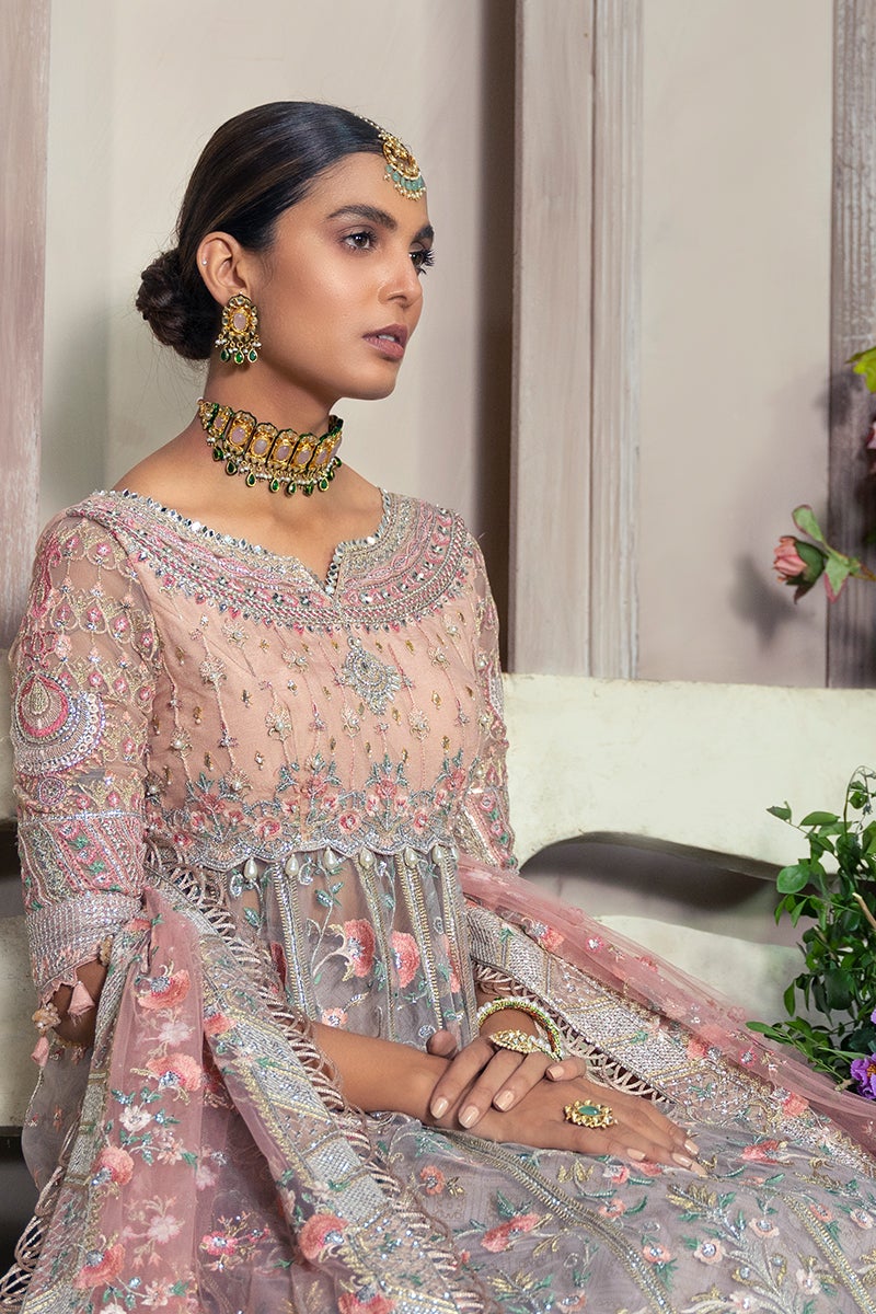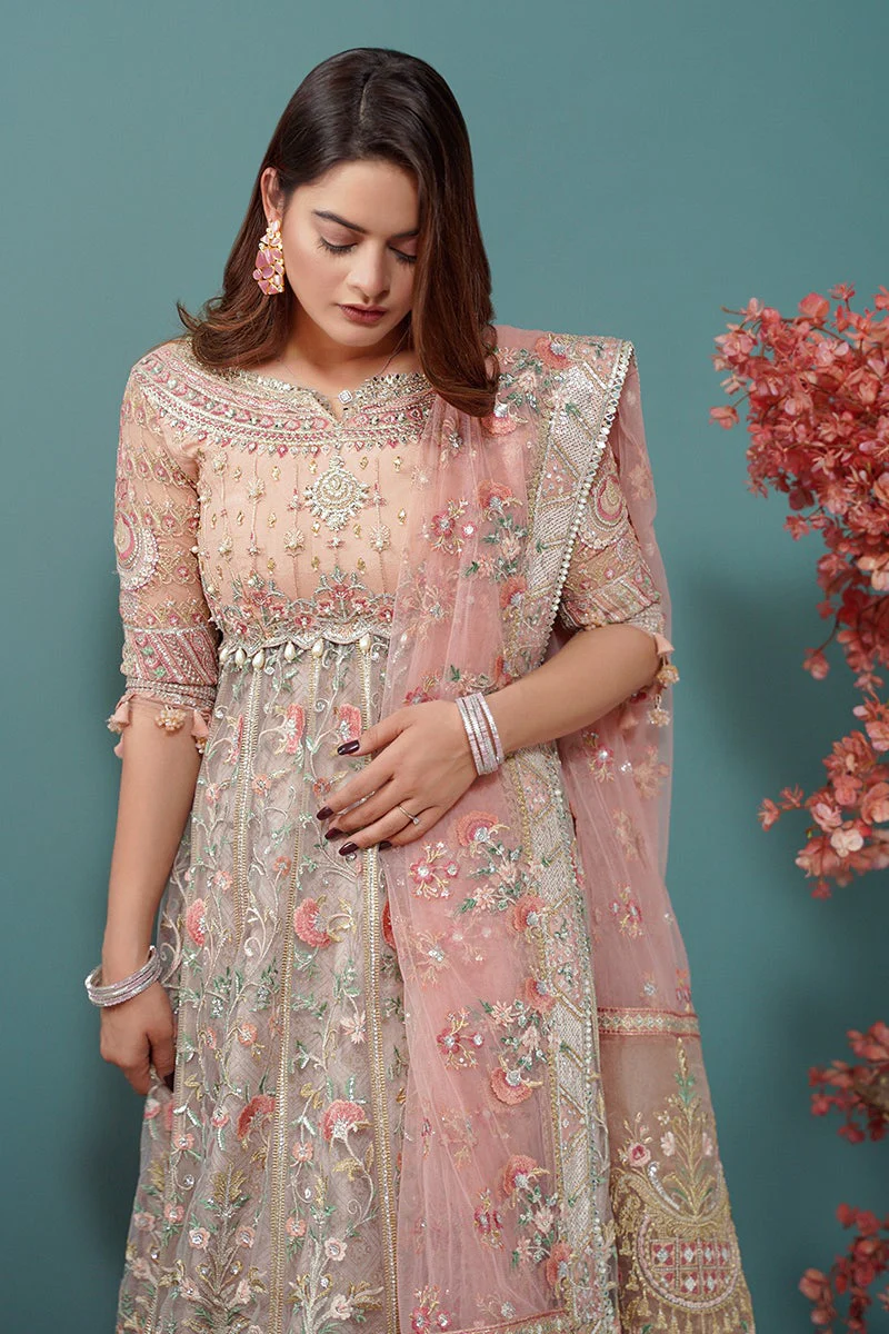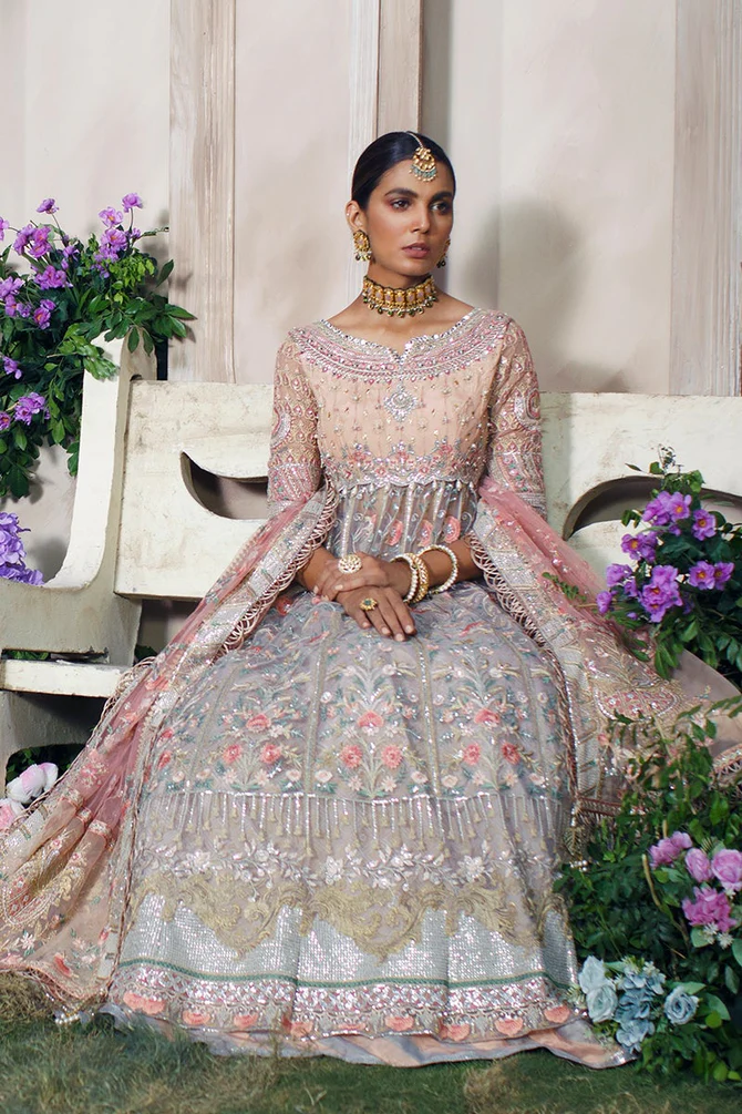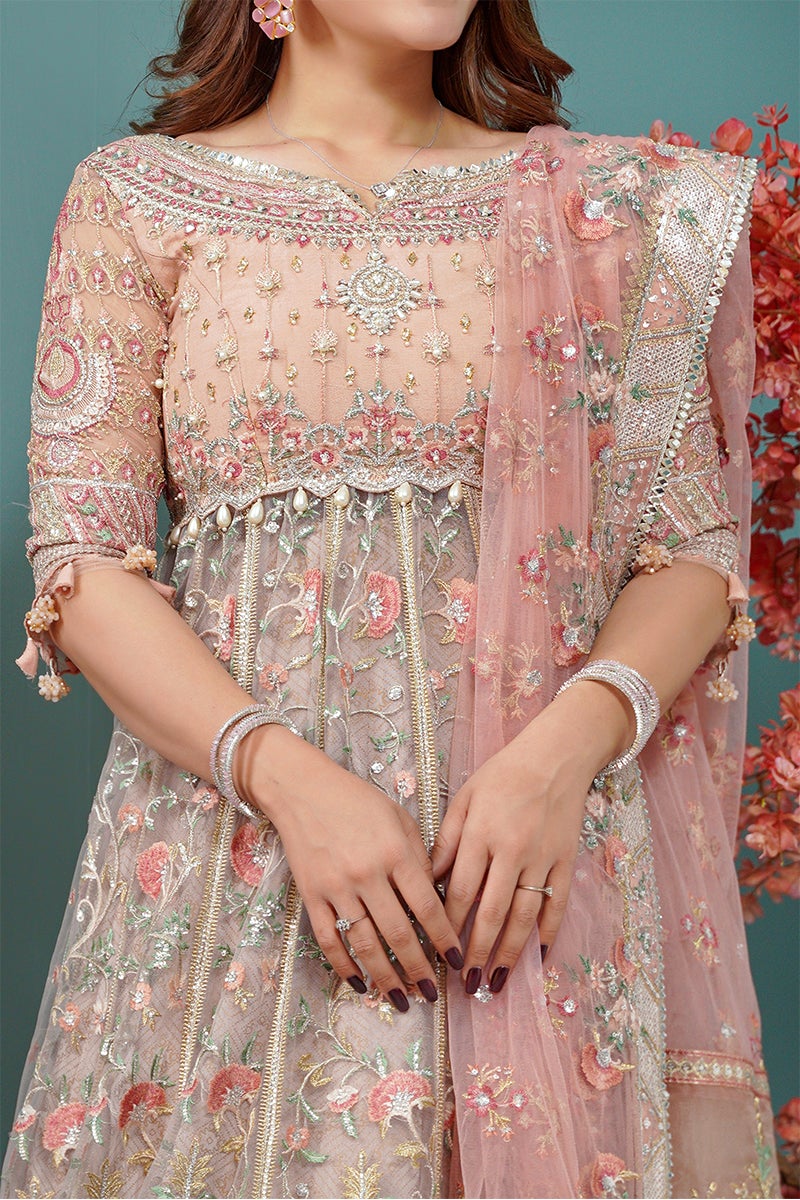 The frock is designed in an alluring pink shade using premium-quality net fabric. It features intricate floral embroidery, sequins, and gota accents, making it a showstopper for the wedding day. Embroidered neckline, sleeves, and borders add refinement, making the frock the centerpiece of the ensemble.