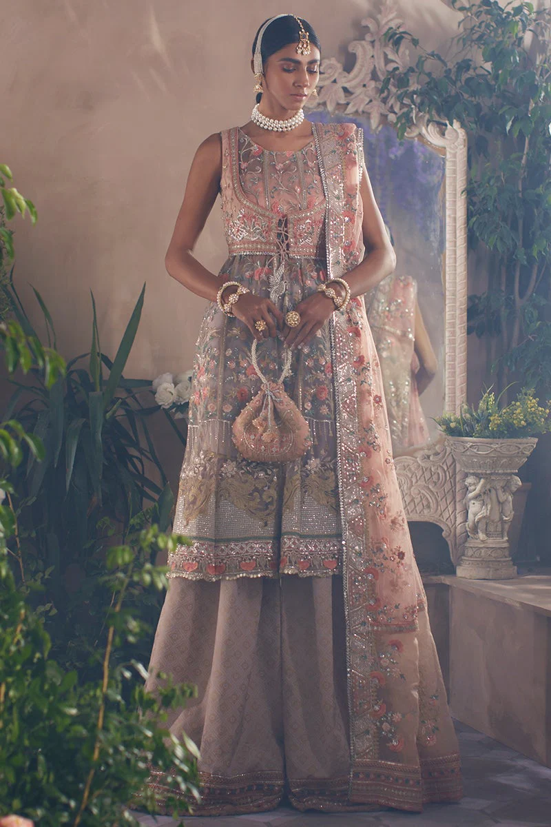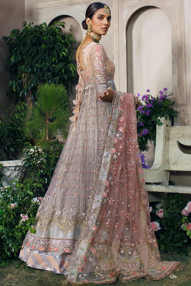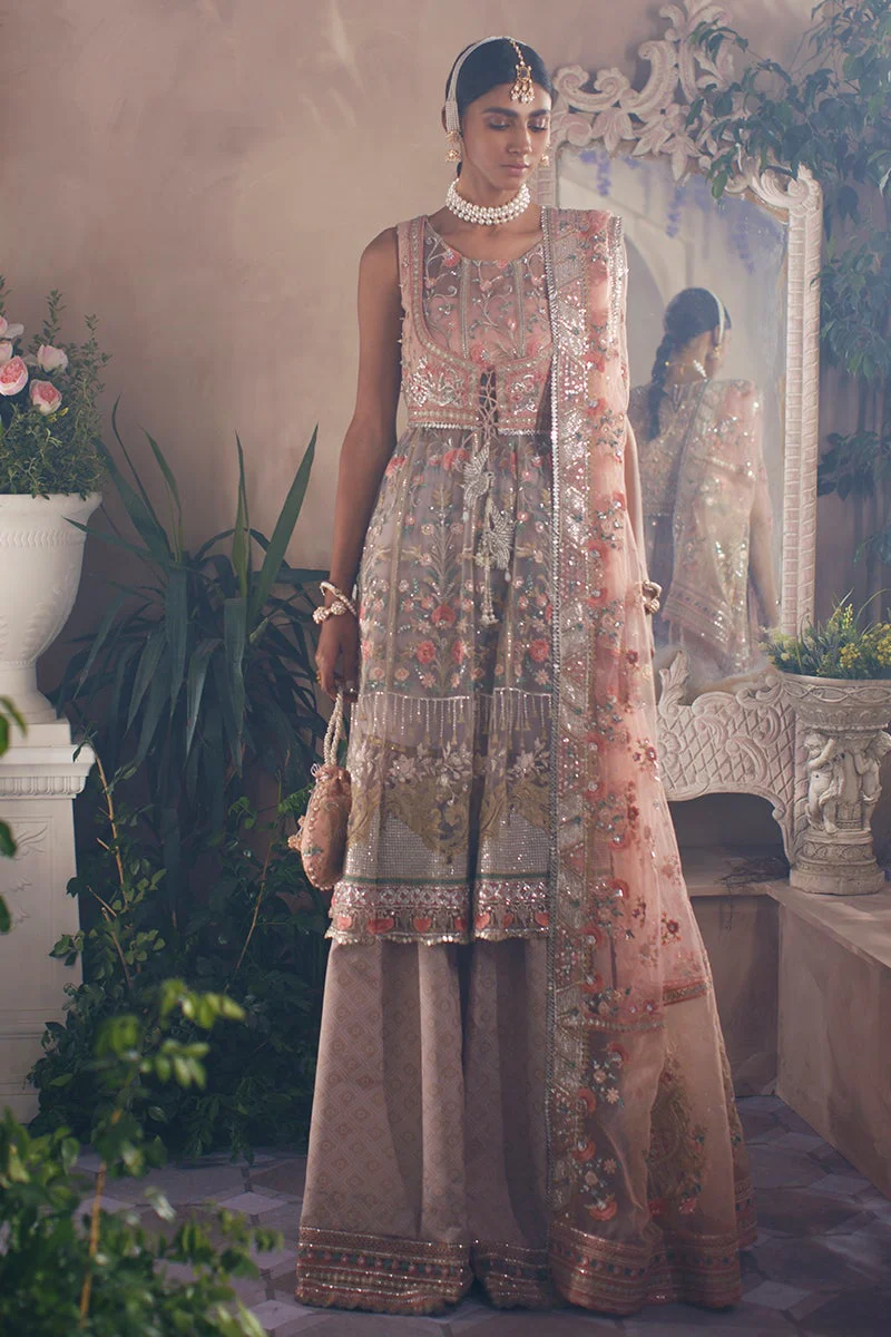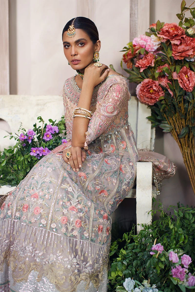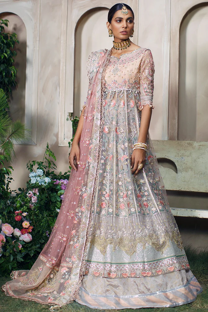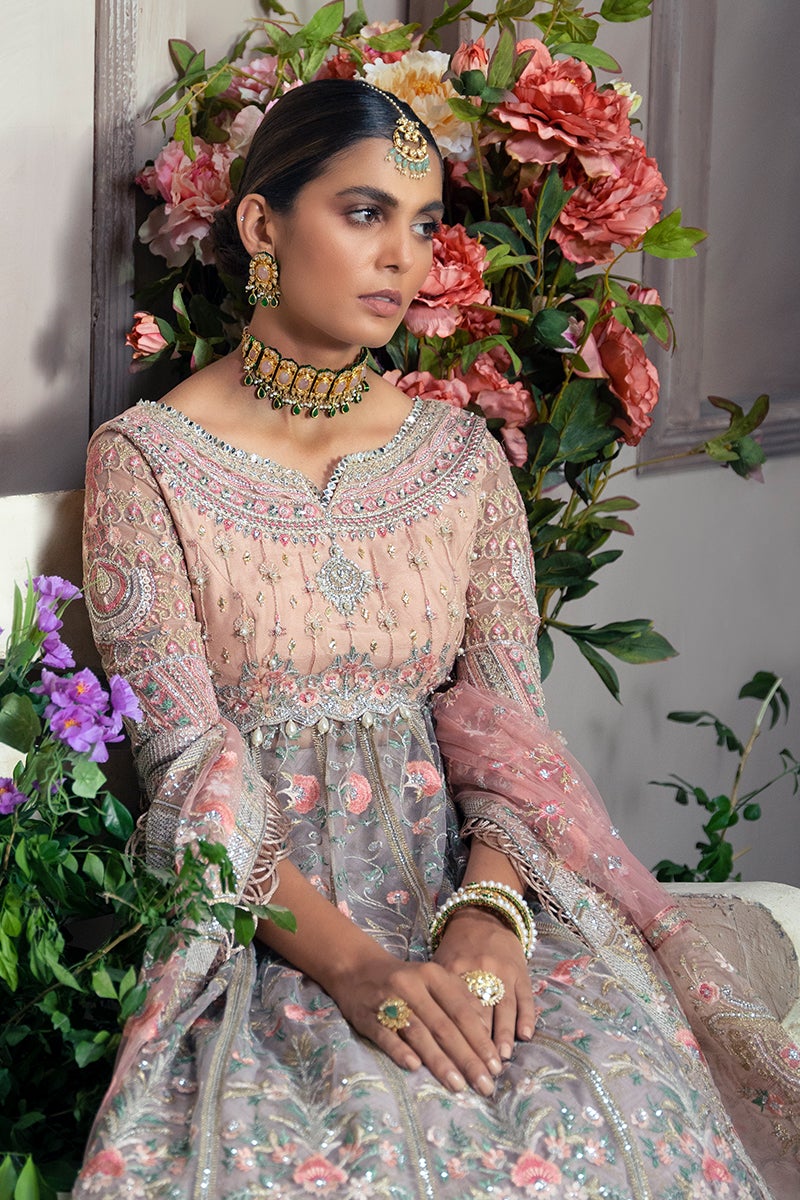 The frock is designed in an alluring pink shade using premium-quality net fabric. It features intricate floral embroidery, sequins, and gota accents, making it a showstopper for the wedding day. Embroidered neckline, sleeves, and borders add refinement, making the frock the centerpiece of the ensemble.