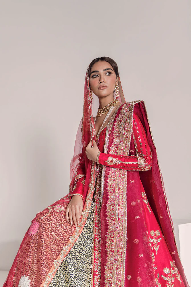 A striking vermillion-pink raw silk pishwas paired with a lavishly hand-embellished lehenga and two exquisitely detailed dupattas, featuring pearls, naqshi, crystals, and intricate applique and gota work for a truly regal ensemble.