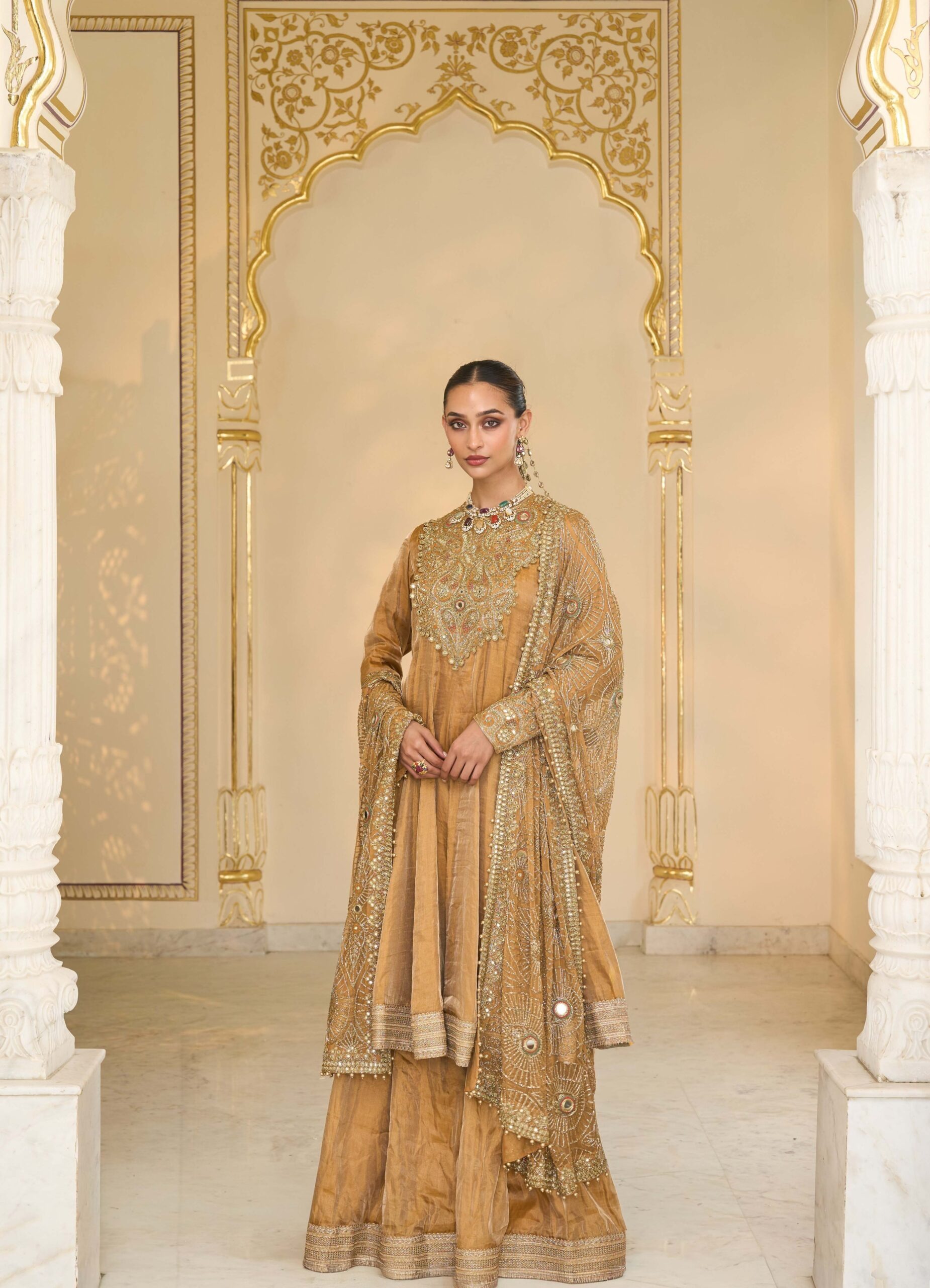 A beautifully crafted copper-and-beige short anarkali with a coordinated sharara and an intricately detailed net dupatta, designed for refined festive and wedding elegance.