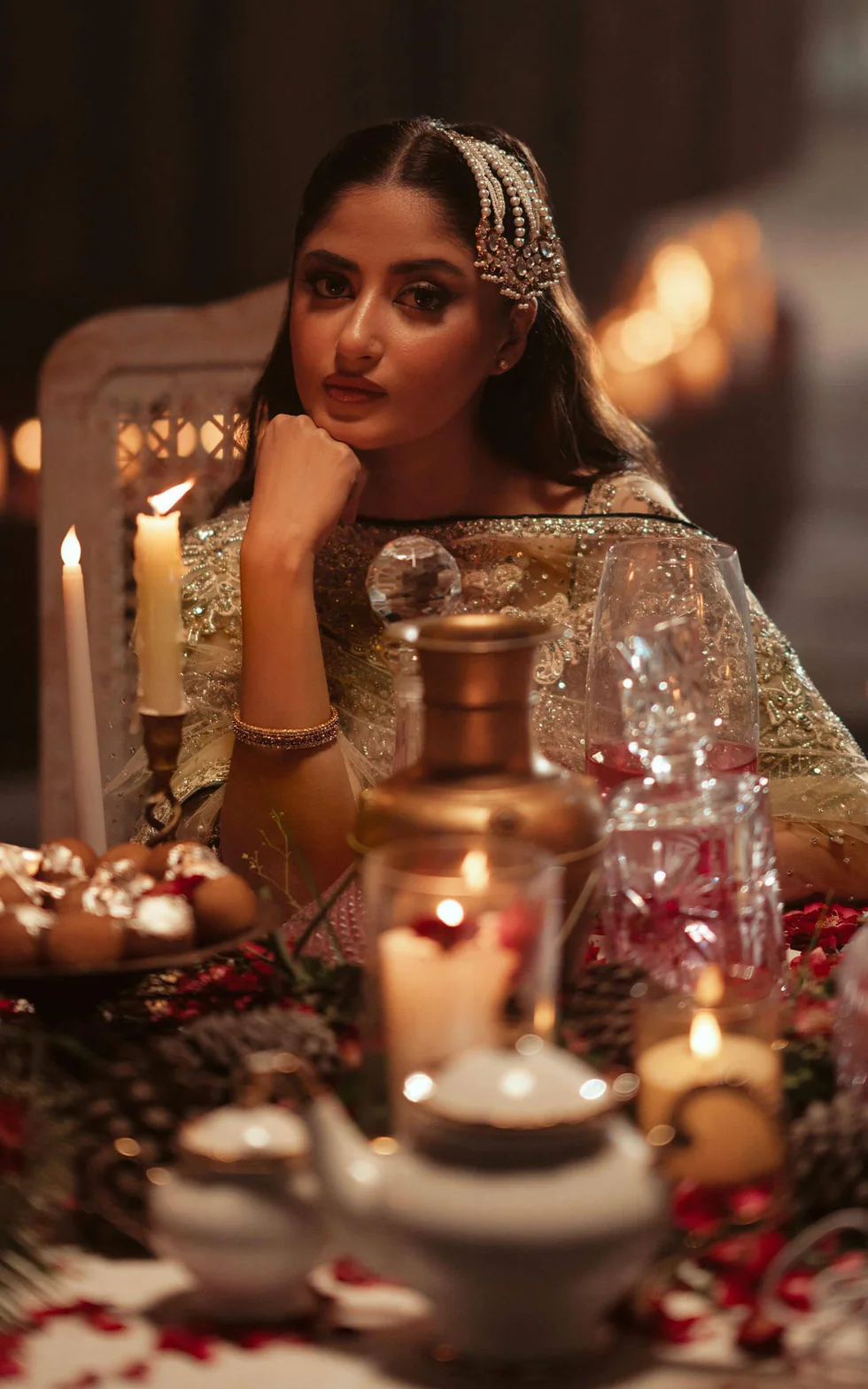 The dupatta is crafted from sheer net in a matching golden tone. It features delicate all-over embellishment accompanied by heavily decorated borders. The soft transparency and meticulous detailing enhance the ensemble’s regal charm while preserving an airy, graceful drape.