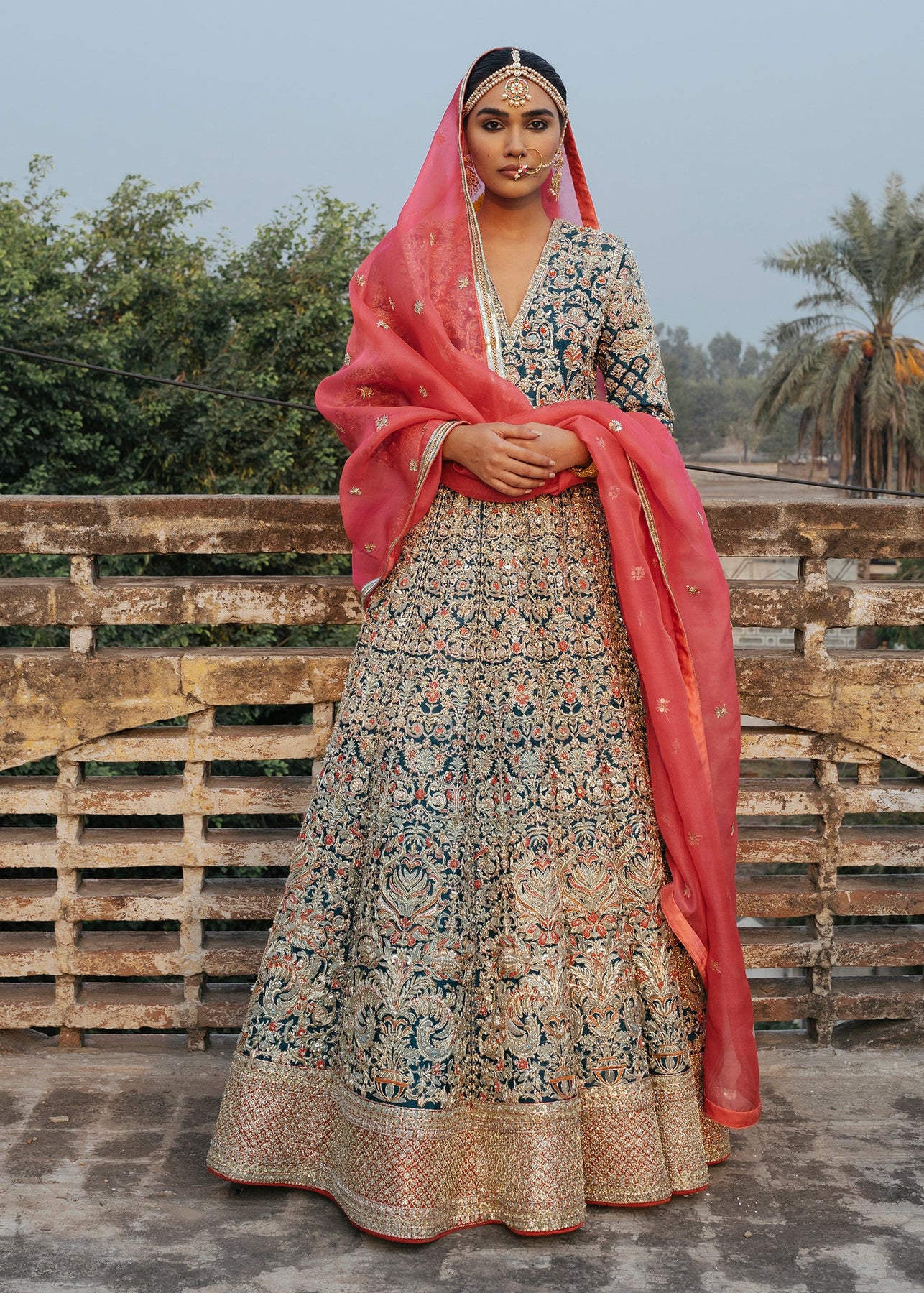 Completing the ensemble is a delicate pink net dupatta that adds a soft, romantic contrast to the grey gown. Its edges are meticulously adorned with hand-embroidered floral motifs, sequins, and subtle embellishments, perfectly complementing the gown. The dupatta flows gracefully, lending a charming finishing touch to the bridal attire.