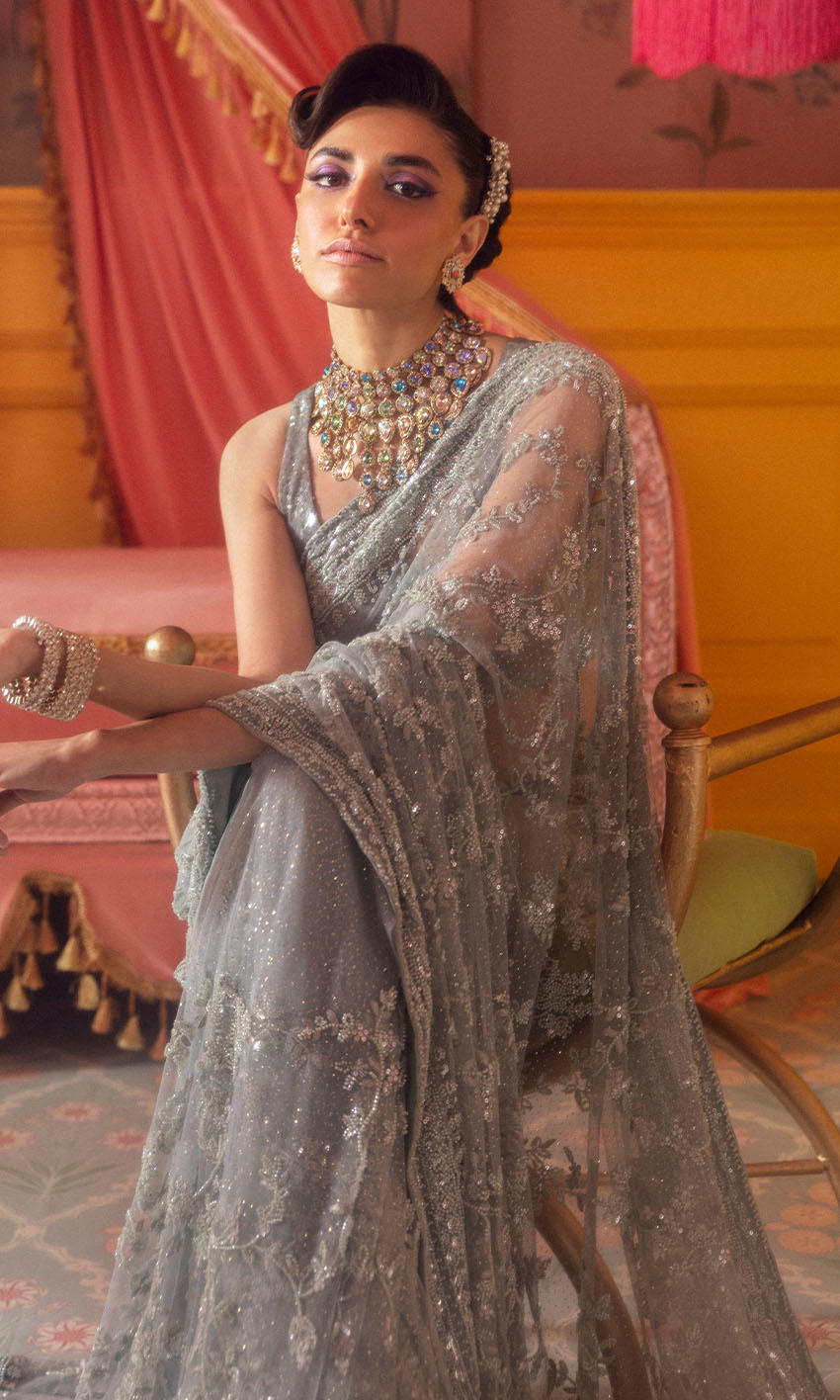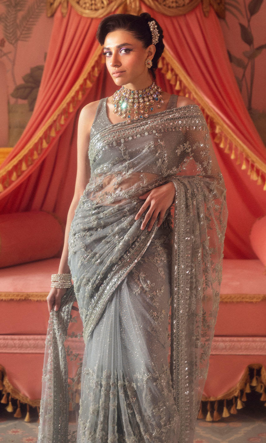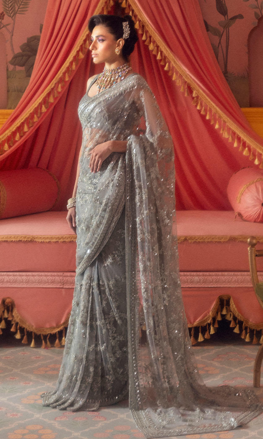Hand-embroidered detailing paired with crystal accents to create a misty, ethereal effect throughout the ensemble.