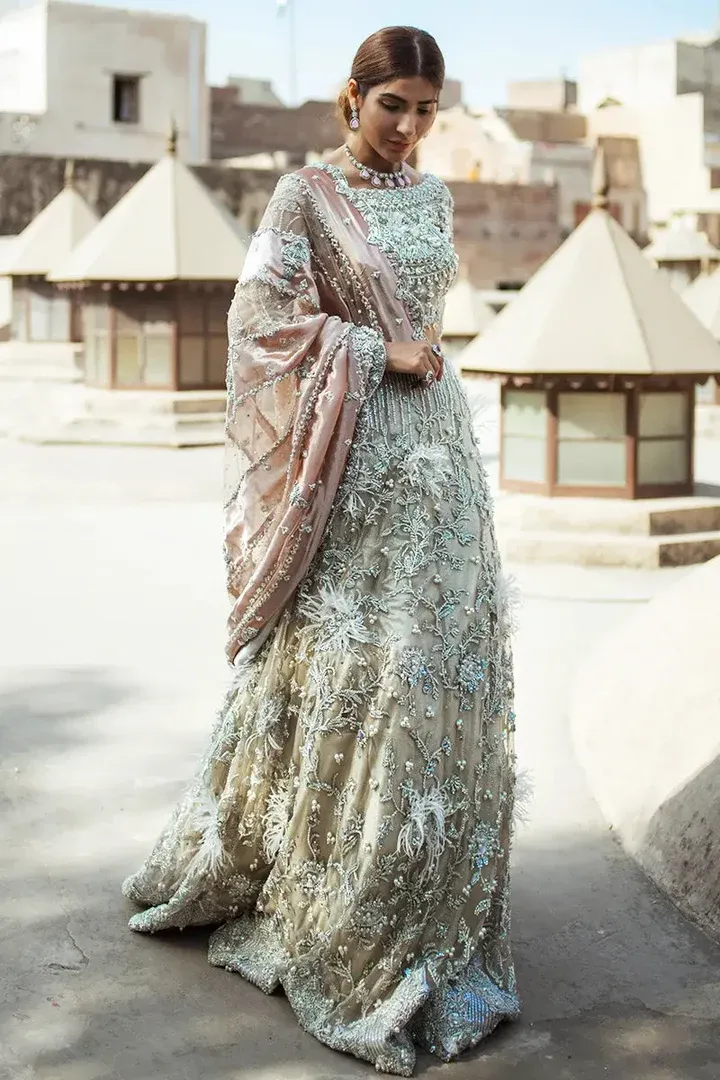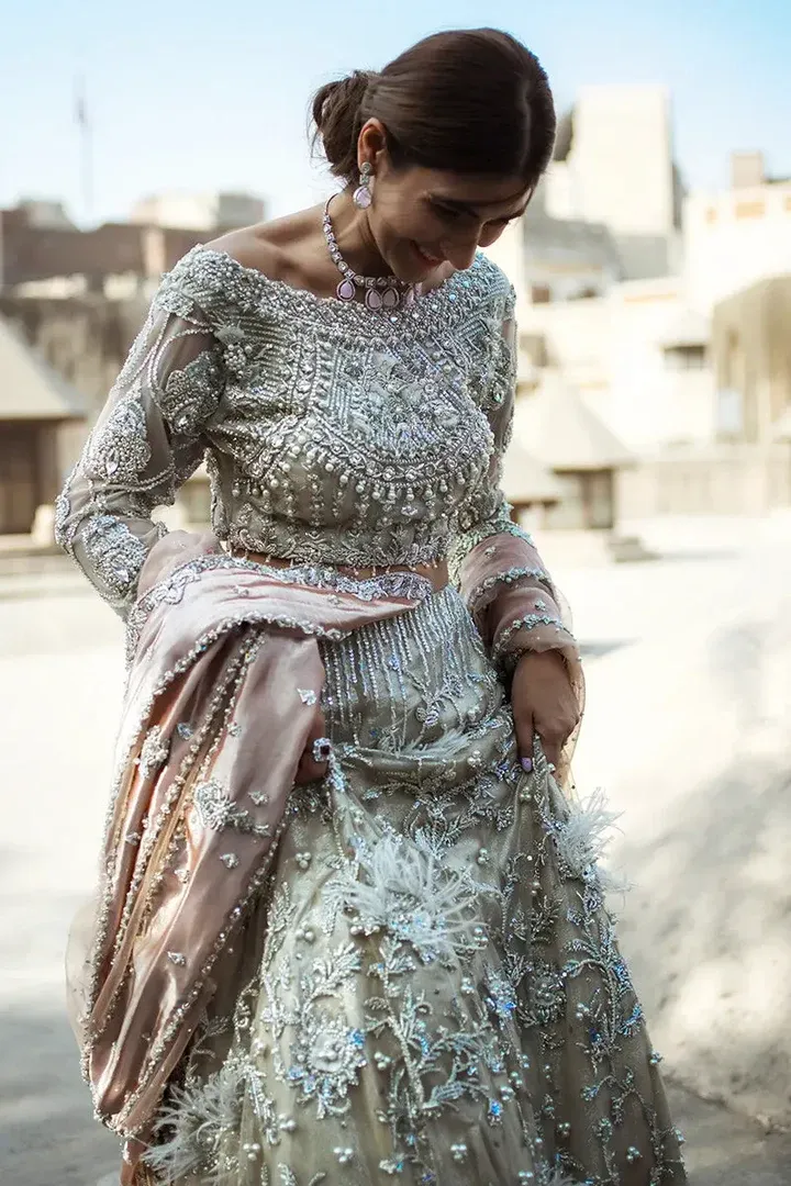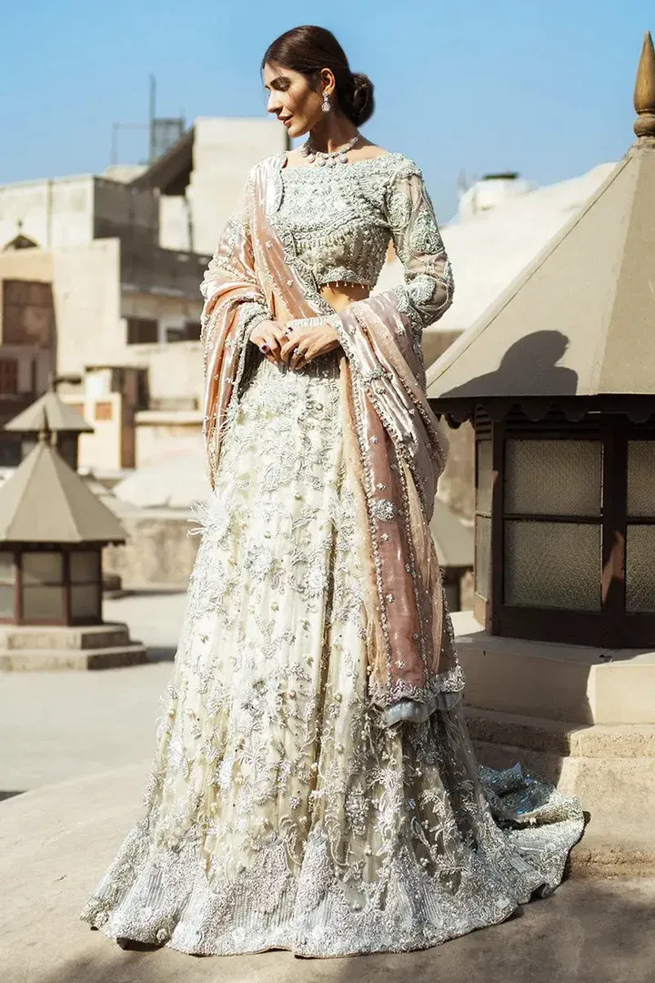A luxurious ivory bridal ensemble crafted with intricate handwork, premium fabrics, and refined embellishments, designed to create an unforgettable, regal bridal presence.