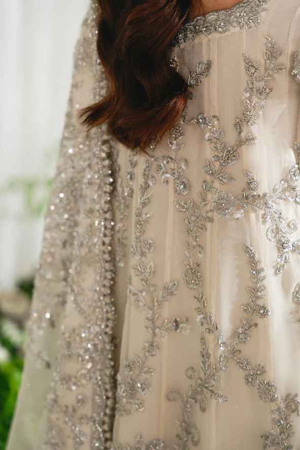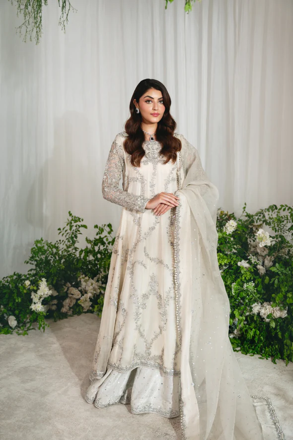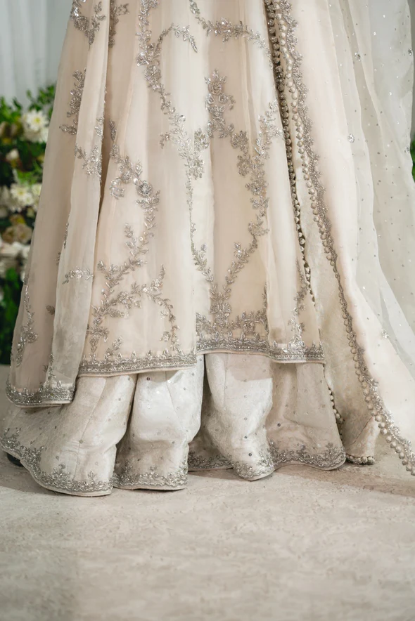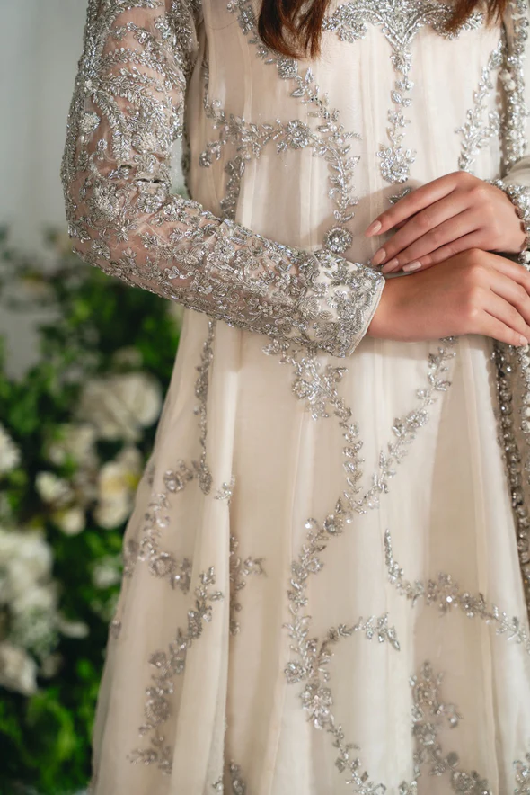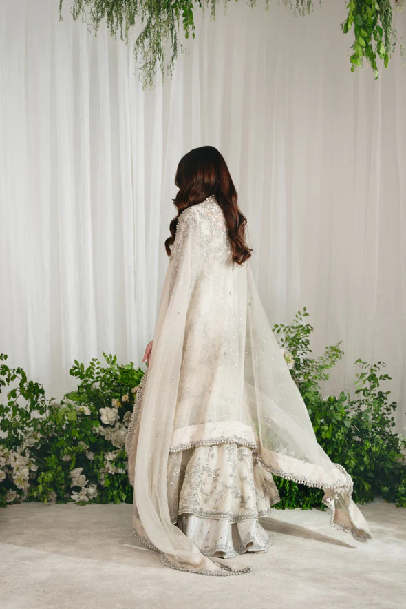 The kalidaar is designed in ivory pure soft tissue and tailored into a long, flowing silhouette that drapes effortlessly. It is richly embellished with hand silver ada work, creating a luminous and refined bridal aesthetic. Brocade finishings enhance the overall elegance, while the inner lining ensures comfort and structure.