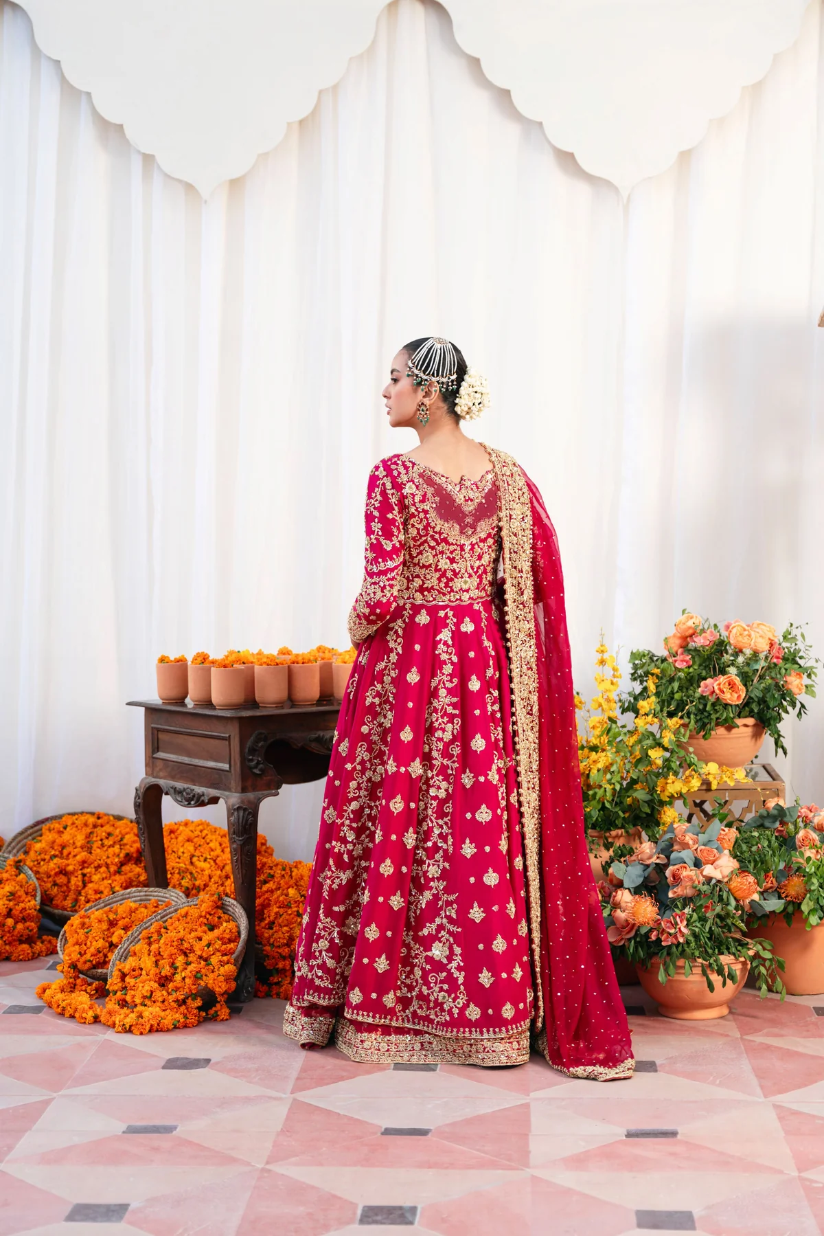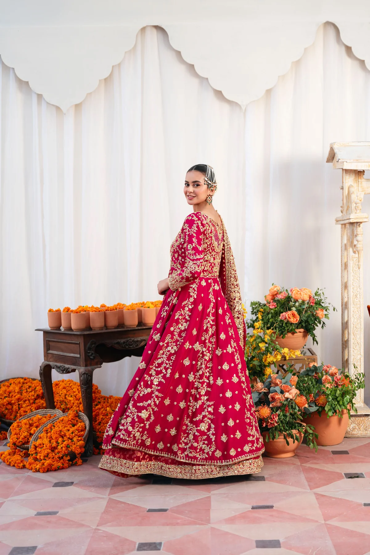 A majestic maroon bridal kalidaar crafted from pure raw silk and enriched with gold hand ada work, paired with a statement dupatta and jamawar panelled skirt for a contemporary bridal look.