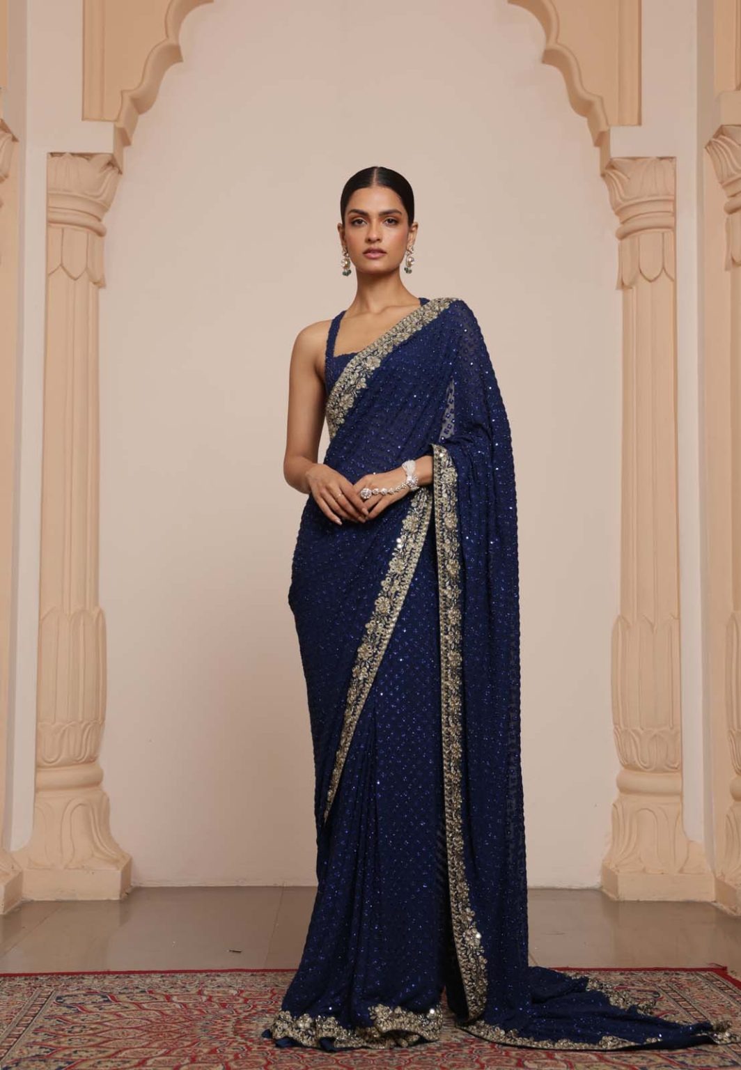 The sari is crafted in a rich midnight blue base accented with beige-gold details, creating an elegant interplay of contrast and depth. Designed for a fluid drape, it showcases hand-embroidered artistry that enhances the sophistication of the silhouette. The blend of colors and textures gives the ensemble a luxurious finish suitable for formal and festive events.