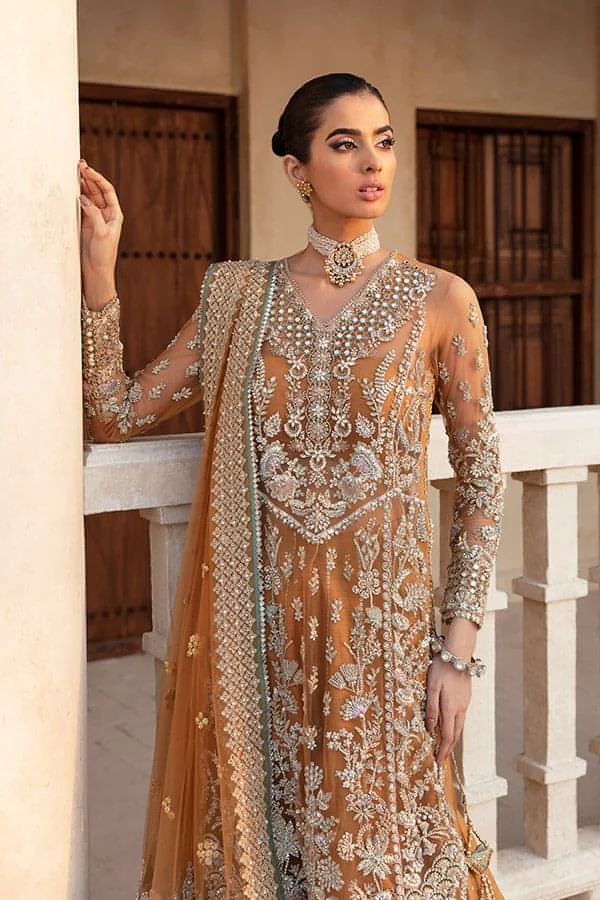 The gown is crafted from luxurious rust-hued fabric, designed to drape gracefully while showcasing meticulous handwork. Gotta and dabka naqshi embroidery adorn the surface, enhanced with soft pink and lilac thread detailing to create a feminine, sparkling effect. The silhouette is tailored for a flattering, elegant fit, ensuring the bride or guest radiates confidence and sophistication.