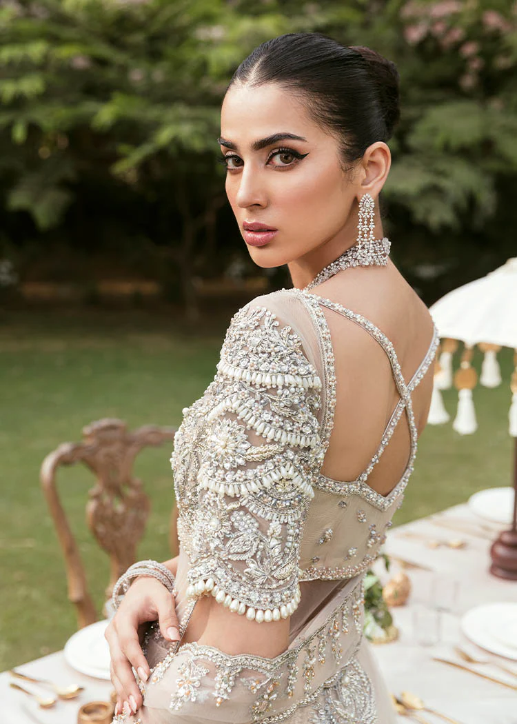 The sharara is cut from brocade with a crushed, voluminous finish that gives beautiful movement and fullness. Its rich texture pairs perfectly with the delicate sparkle of the gown, creating a balanced and striking look.