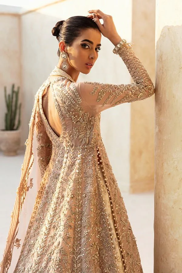 The gown is crafted from luxurious peach organza, designed to flow elegantly while showcasing intricate handwork. Celestial kamdani embroidery, including naqshi, dabka, and resham, is delicately applied throughout, complemented by sparkling crystal accents. The opulent detailing ensures the gown shimmers beautifully, creating a breathtaking effect for the bride’s ceremonial entrance.