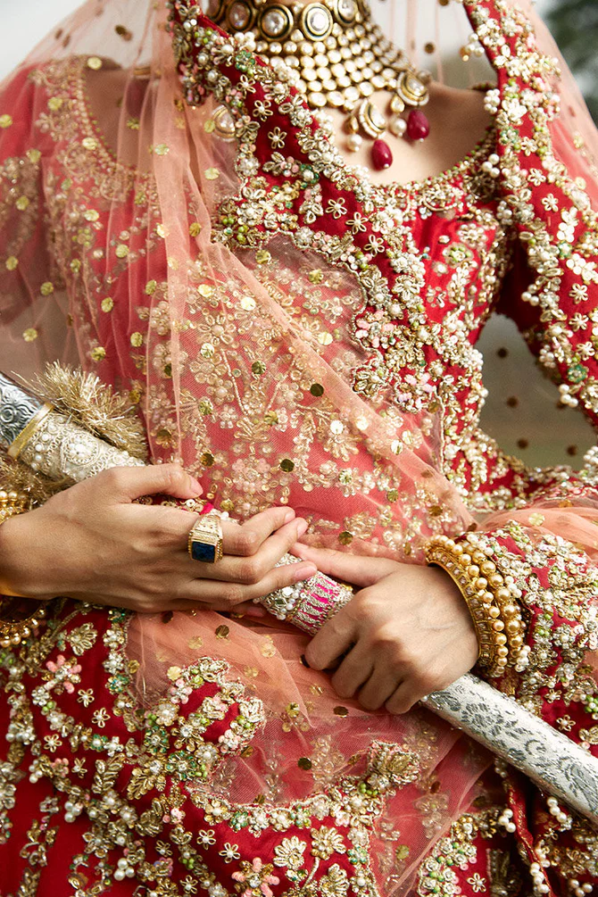 Handcrafted using pearls, crystals, sequins, zardozi, tilla, mukesh, and adda work. Slight artisanal variations may appear, reflecting the authenticity of hand embellishment.