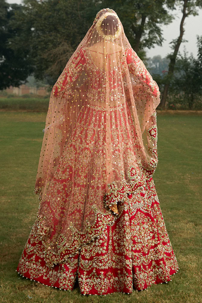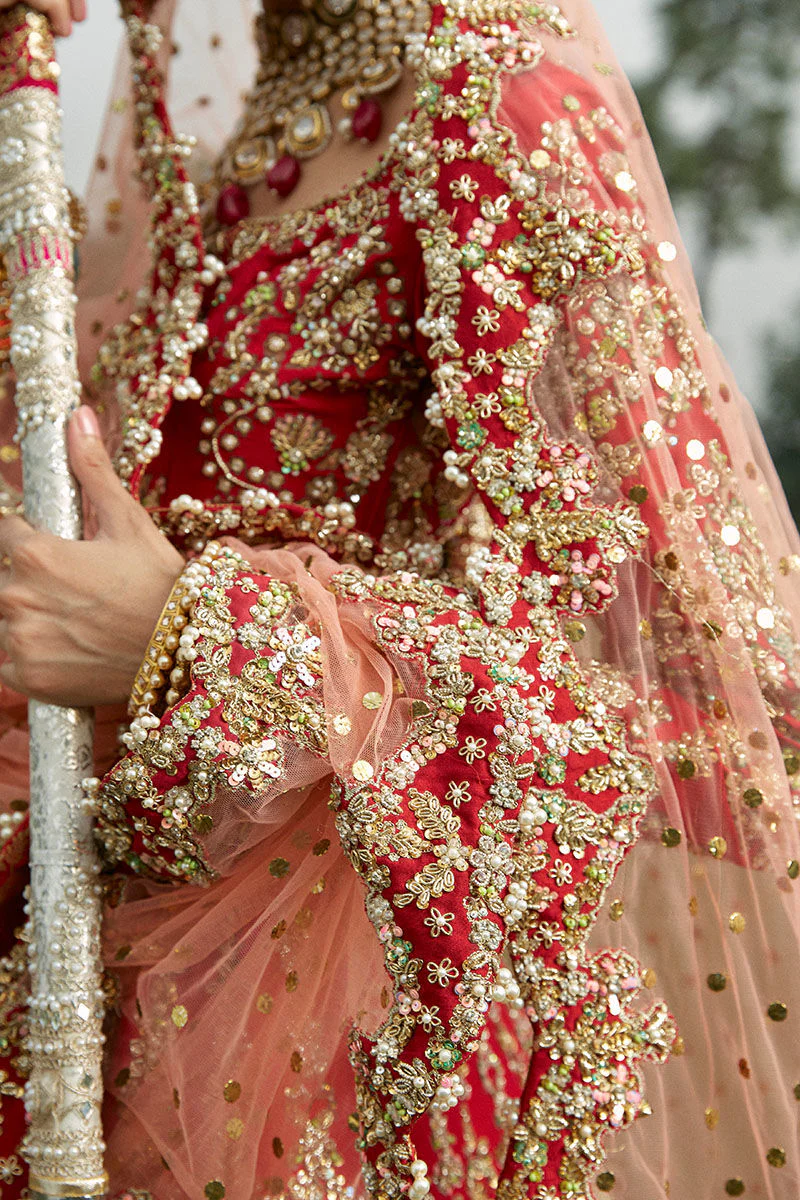 A luxurious cherry red bridal ensemble featuring a raw silk lehenga and choli with intricate hand embellishments of pearls, crystals, sequins, and zardozi, paired with a mukesh net dupatta and a statement raw silk pouch for a regal finish.