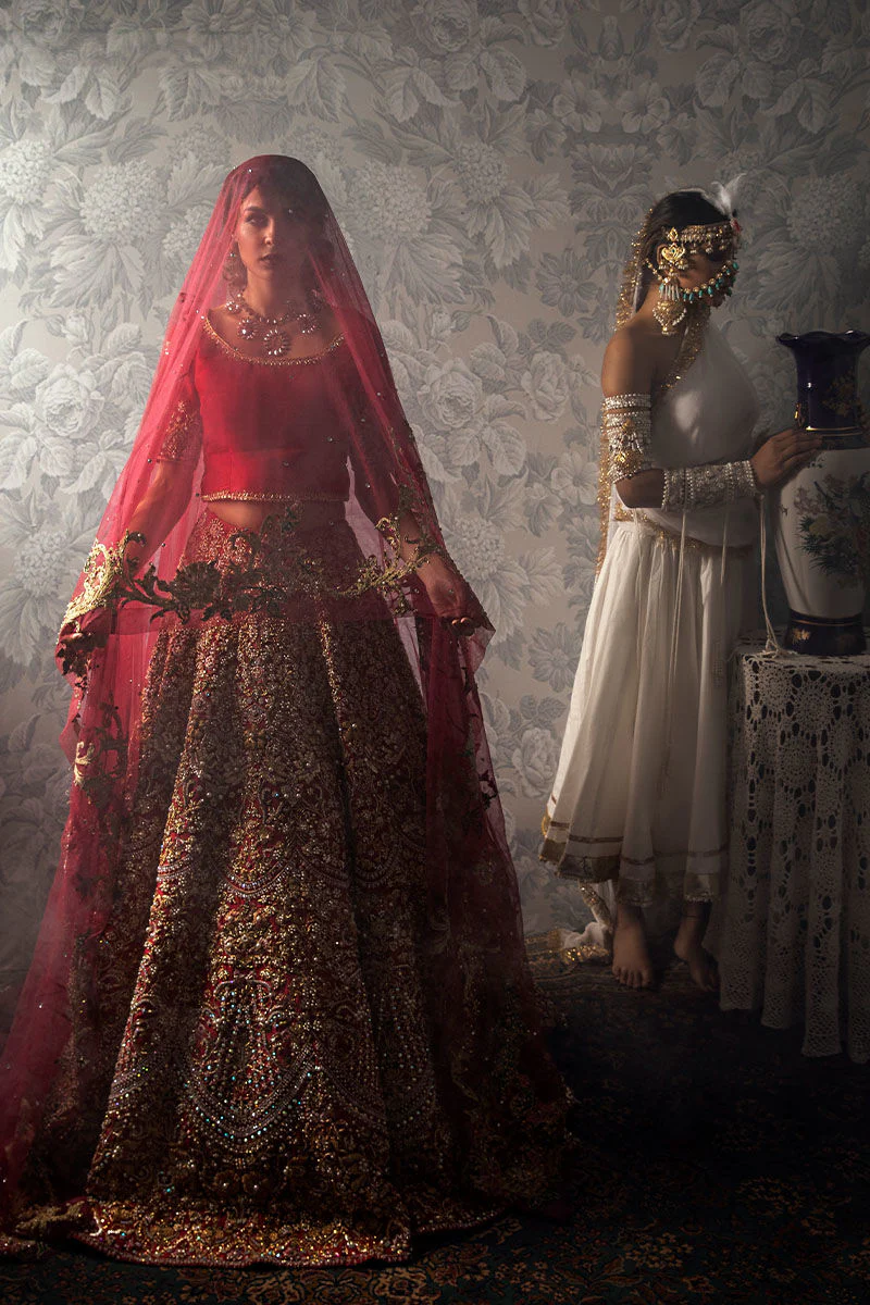 Handcrafted with resham, thread, Swarovski crystals, pearls, dabka, sitara, naqshi, and patchwork applique for a luxurious and ornate bridal ensemble.