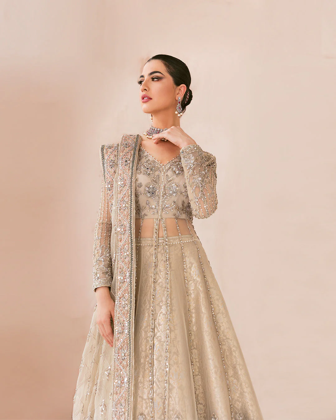 An opulent Pakistani bridal ensemble featuring a premium net pishwas gown, intricately embellished with silverwork, pearls, and stones, paired with a flared Jamawar lehenga and a delicately adorned net dupatta for a regal bridal look.