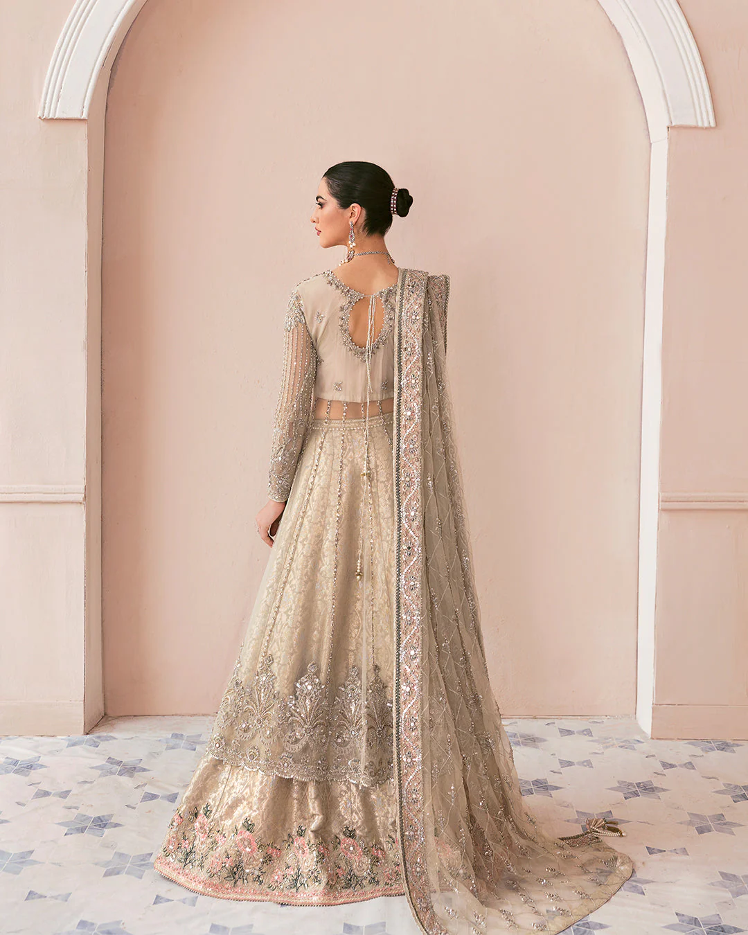 The net dupatta features heavily embellished borders, perfectly framing the ensemble. Delicate silverwork and floral accents add elegance and refinement, ensuring the bride exudes sophistication. The dupatta enhances the overall grandeur of the Pakistani bridal attire, harmonizing with both the gown and lehenga.