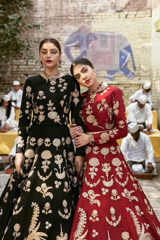 A stunning red raw silk lehenga choli featuring intricate aari embroidery, enhanced with sitara and pearls. Modern silhouette meets festive elegance, perfect for weddings and special occasions.