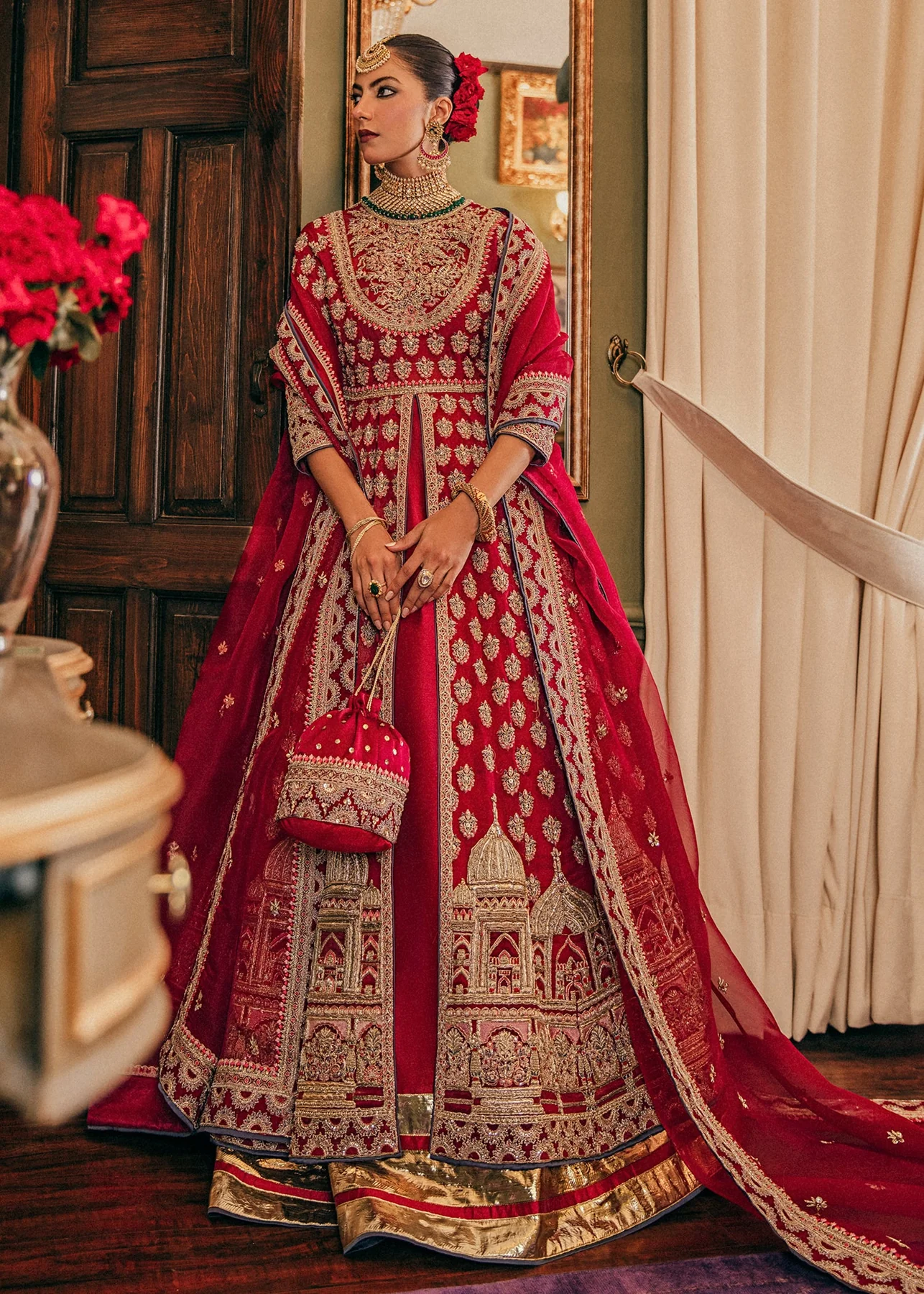 The centerpiece is a majestic, floor-length open-front gown (Angrakha-style) crafted from premium maroon katan silk. The bodice is heavily encrusted with intricate tilla and zardozi work, flowing into a dramatic skirt. A unique feature of this piece is the architectural embroidery along the hem, depicting ornate domes and arches reminiscent of royal Mughal palaces. The front slit reveals the richness of the inner layers, while the sleeves are fully worked in gold, finished with delicate beaded trimmings.