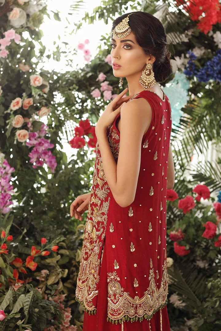 This deep maroon shirt (kameez) is crafted in premium French net and adorned with exquisite hand-embroidered goldwork, sequins, beads, and dabka detailing. The intricate artistry adds a luxurious and traditional touch, making it perfect for bridal or festive occasions.