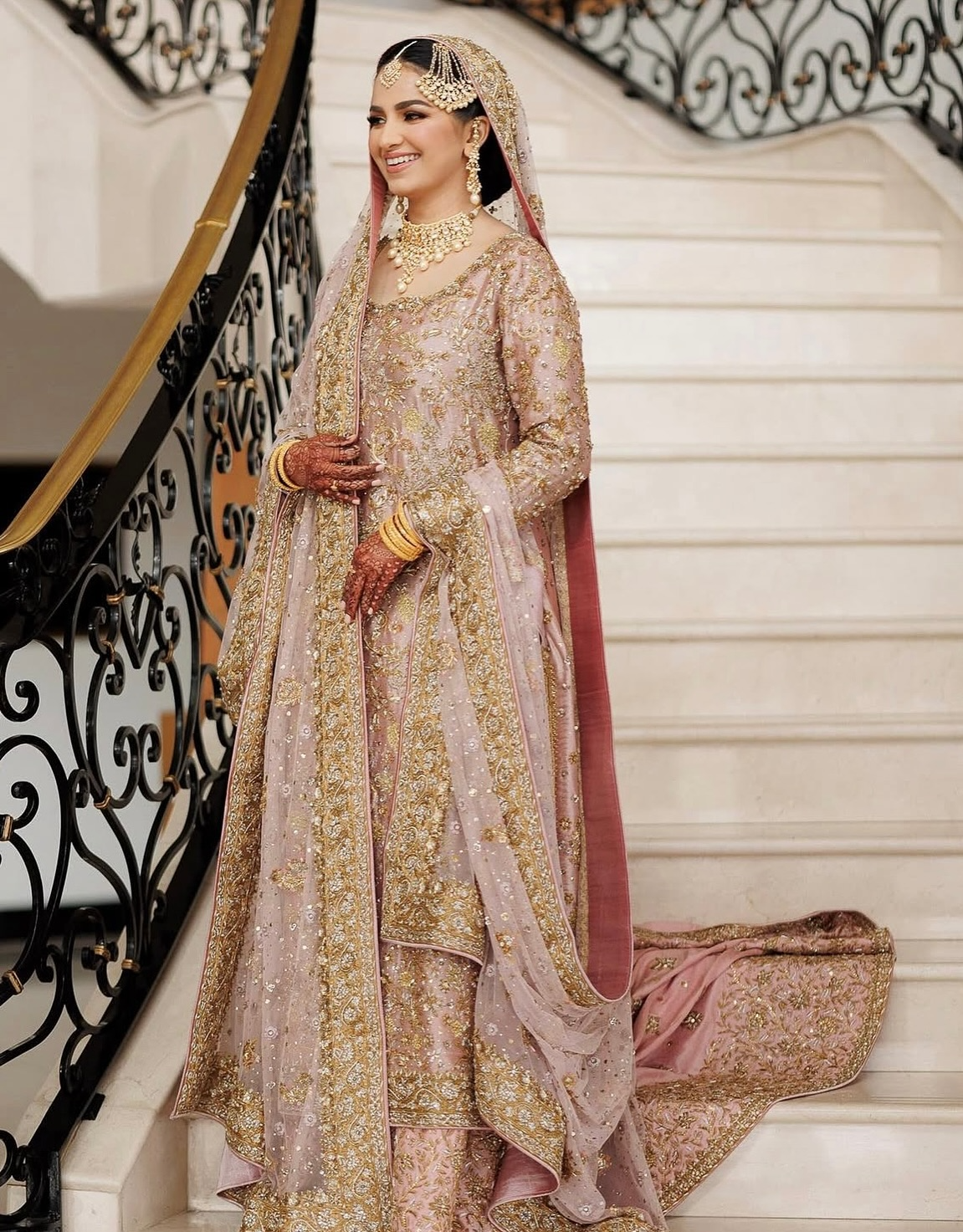 A majestic Pakistani bridal ensemble featuring a long, heavily embroidered dusty rose shirt paired with a voluminous, layered skirt/gharara in complementary blush tones, and a soft net dupatta finished with opulent gold work.