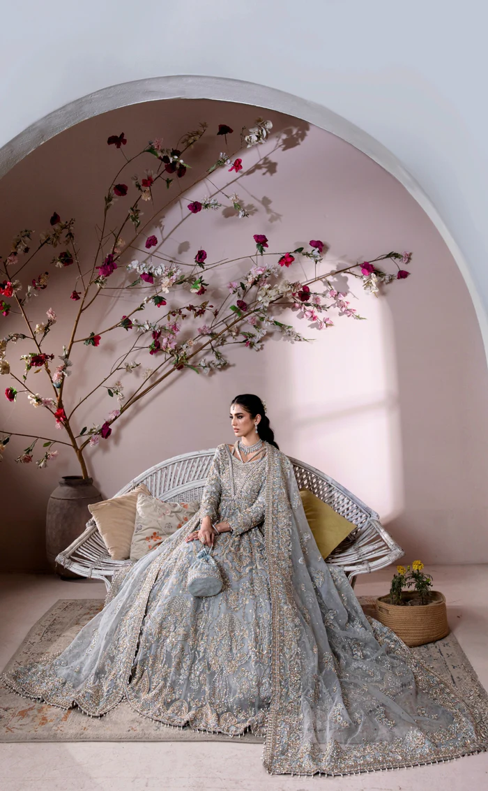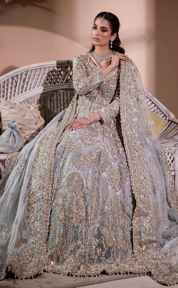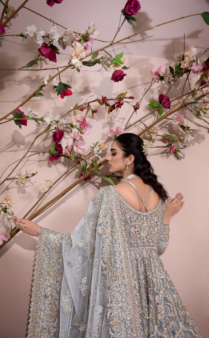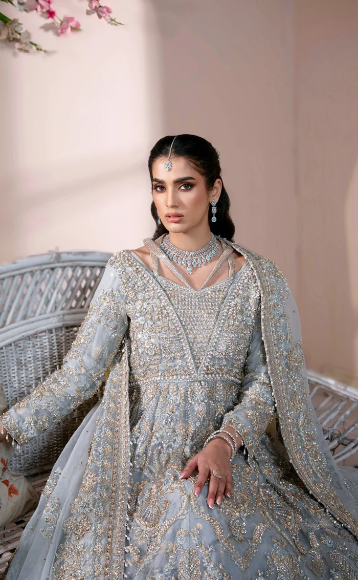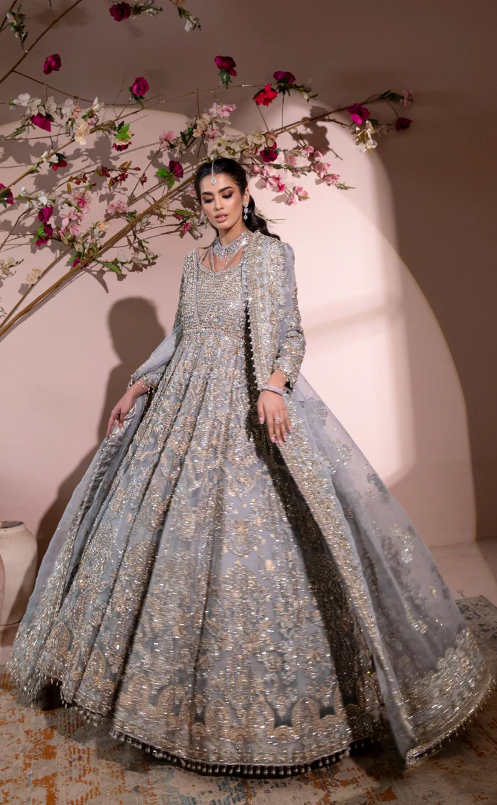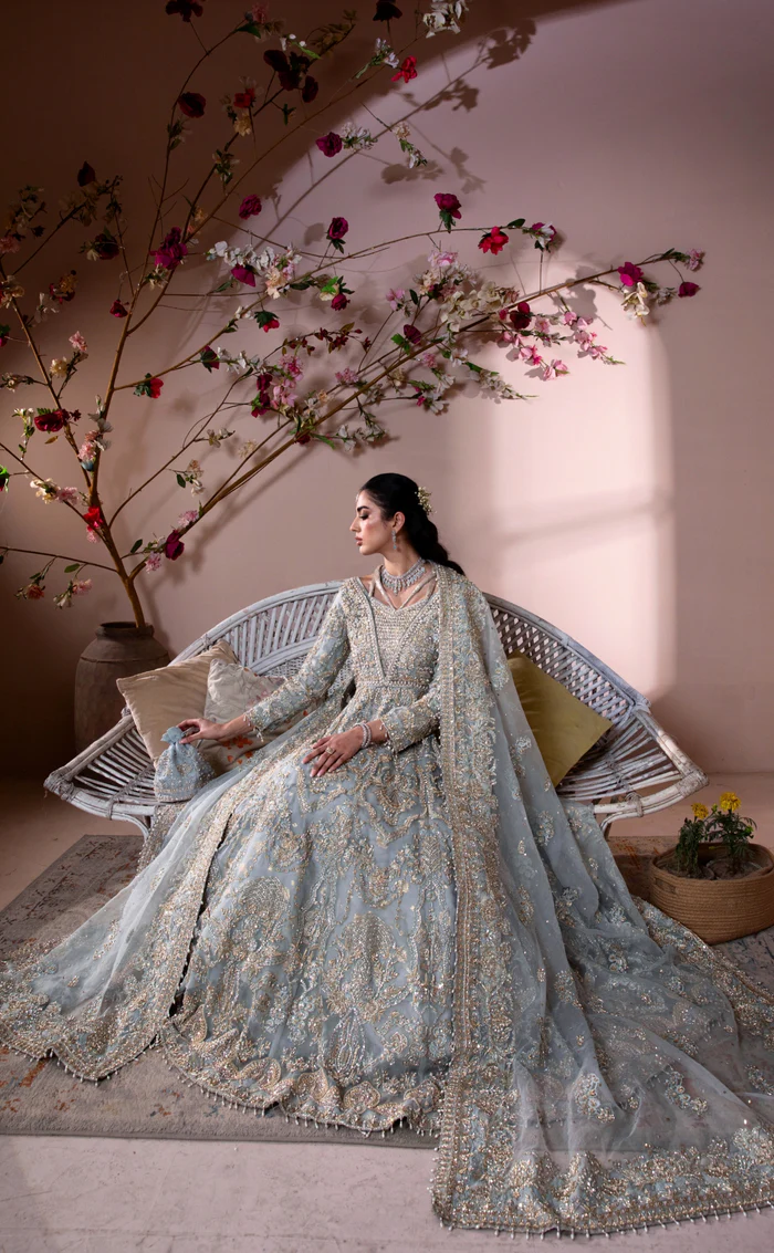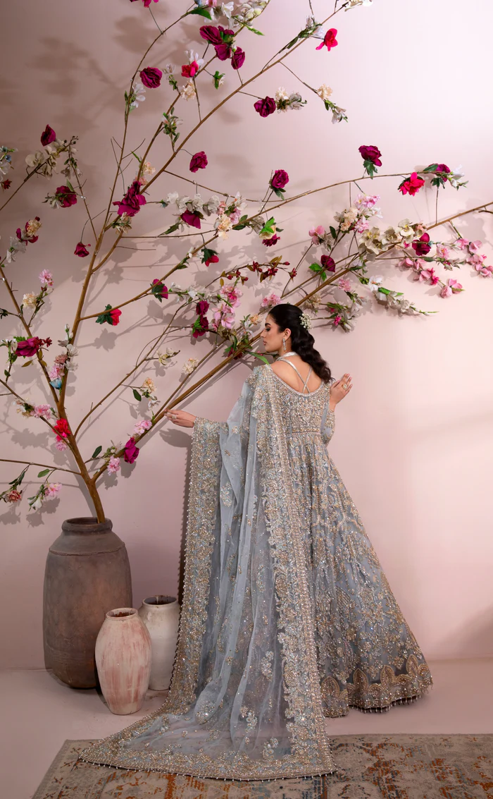 A mesmerizing ice blue maxi gown crafted from pure organza, featuring delicate hand embellishments and a matching dupatta, paired with a luxurious raw silk underdress for a flawless, elegant silhouette.