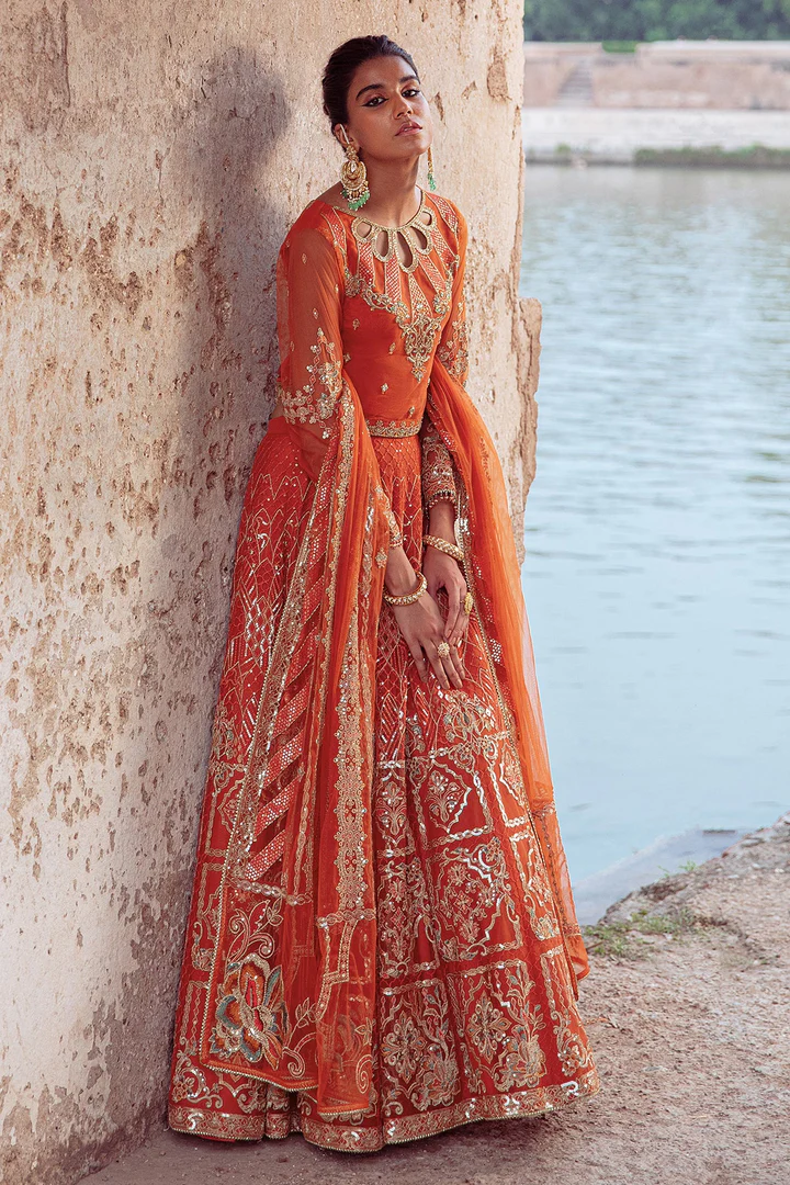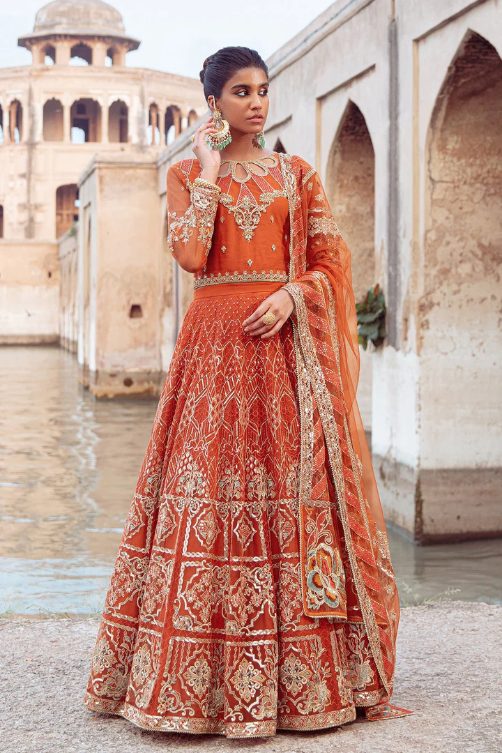 Dry clean only. Store in a protective garment cover to preserve the fabric, net detailing, and intricate handcrafted embellishments.