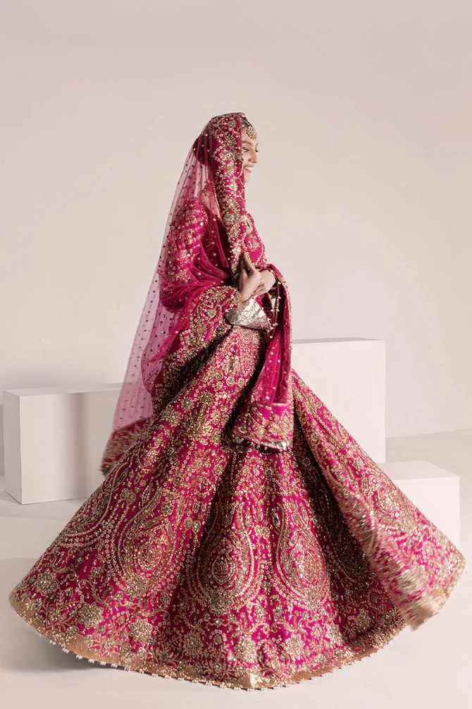A luxurious Pakistani bridal dress in pink raw silk, featuring hand-embellished blouse and skirt with dabka, kora, and sequins, complemented by a net dupatta with contrasting hand-appliqué detailing for a perfect bridal look.