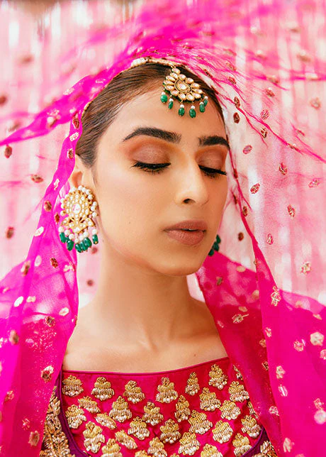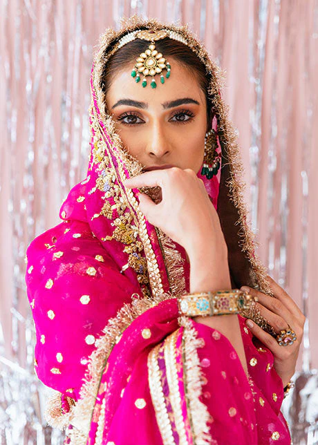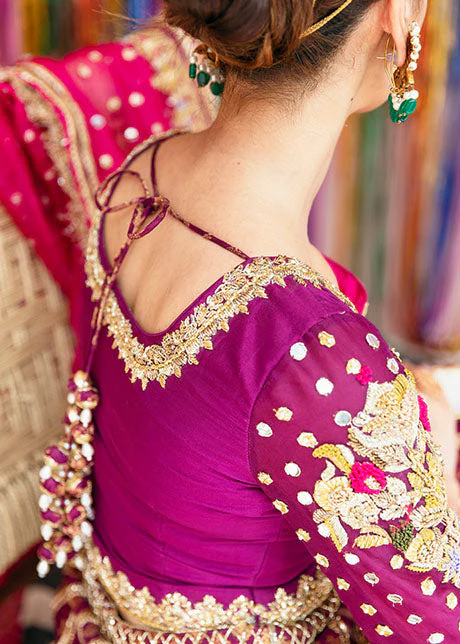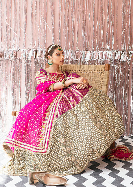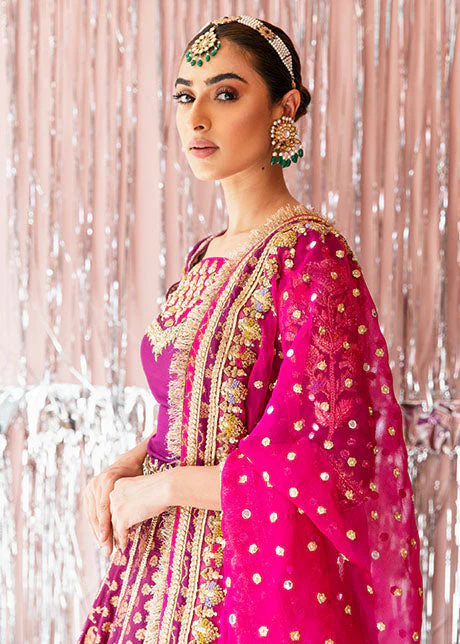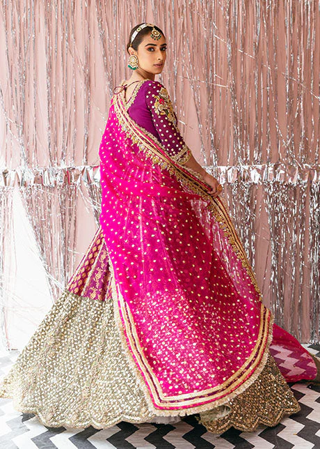 This vibrant plum bridal ensemble features a hand-embellished choli, a flowing lehenga with intricate gota, naqshi, and stone work, and a delicately crafted dupatta. Perfect for Mehndi or wedding celebrations, it exudes traditional charm with a modern, glamorous appeal.