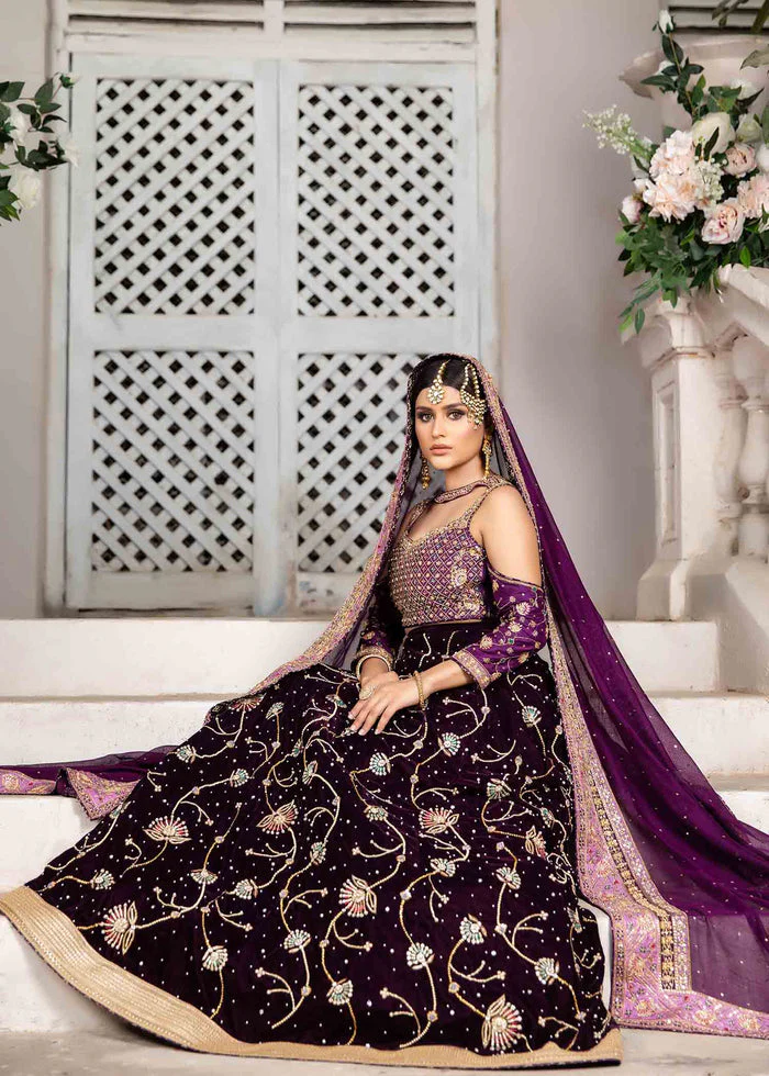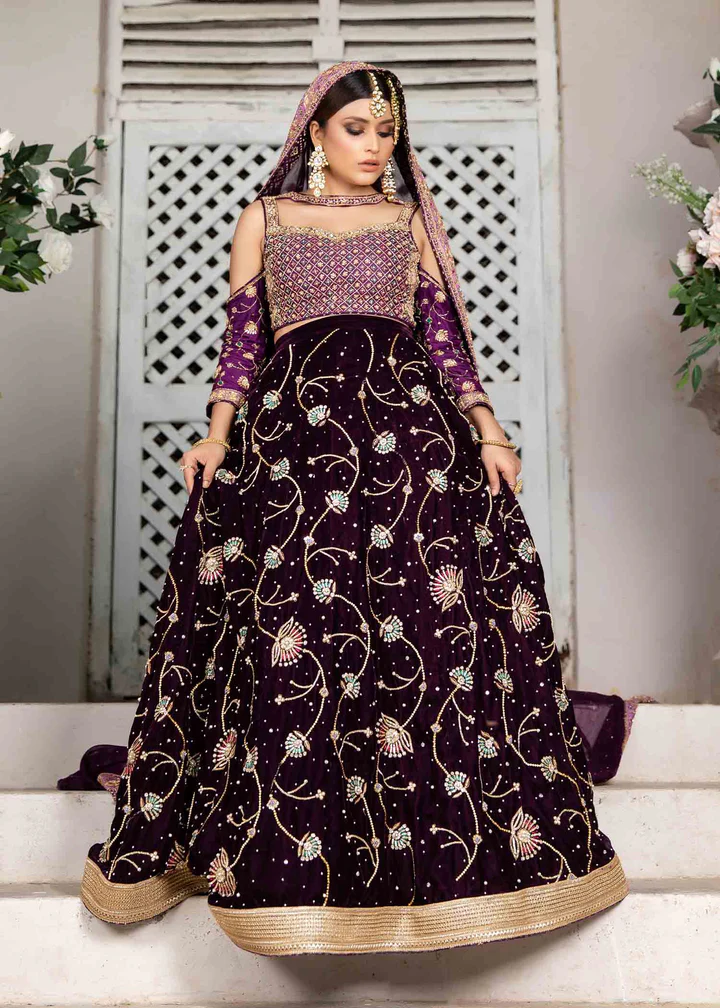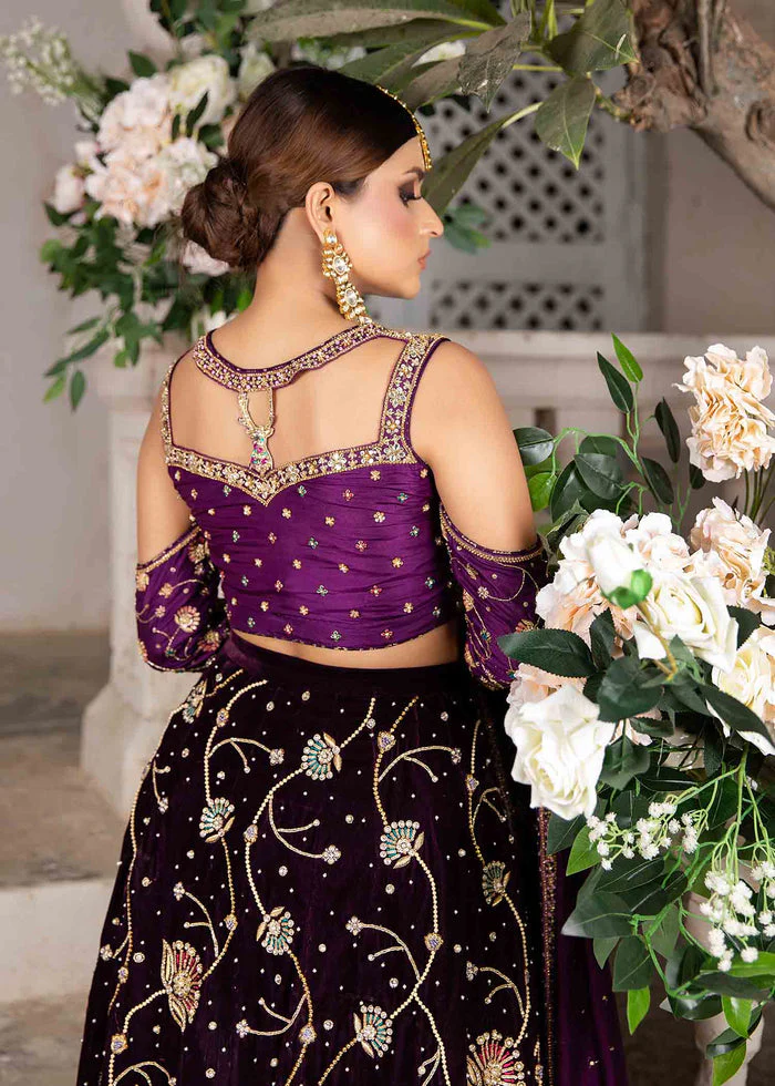 The lehenga is fashioned from matching purple katan silk, designed with a flattering structured fit at the waist and hips before flowing into a voluminous, graceful flare. The lower panels are intricately embellished with handcrafted detailing, while shimmering sequins are delicately sprinkled throughout the fabric for a radiant, glamorous effect. Fully lined and equipped with a discreet side zip, the lehenga provides both elegance and ease of movement.