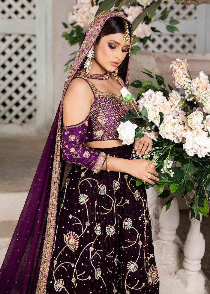 A deep purple chiffon dupatta enhances the ensemble with its soft, airy drape. It features embellished borders with golden appliqué to perfectly coordinate with the top and lehenga. Scattered sequins, beads, and delicate motif placements add gentle luminosity throughout. The edges are finished with a katan lining, ensuring structure while maintaining the dupatta’s graceful flow.