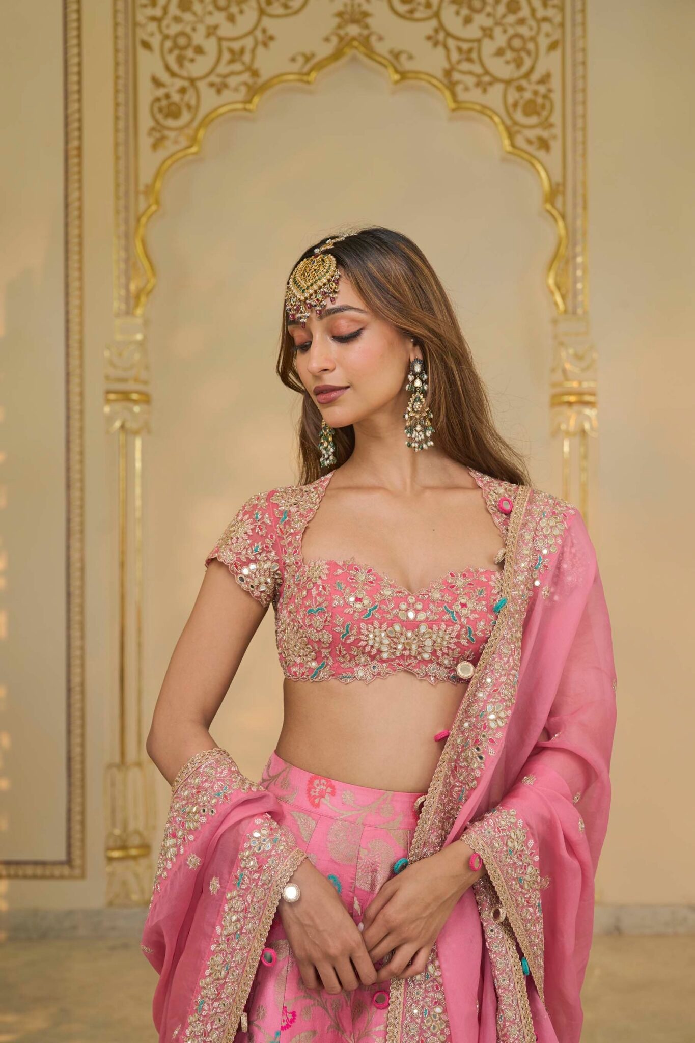This Banarasi lehenga is crafted from custom fabric in a soft pink and rose gold palette. It features meticulous hand embroidery combining mirrors, cutdana, and multi-thread work, creating a rich and textured visual appeal. The silhouette is designed to flow gracefully, offering both elegance and grandeur.