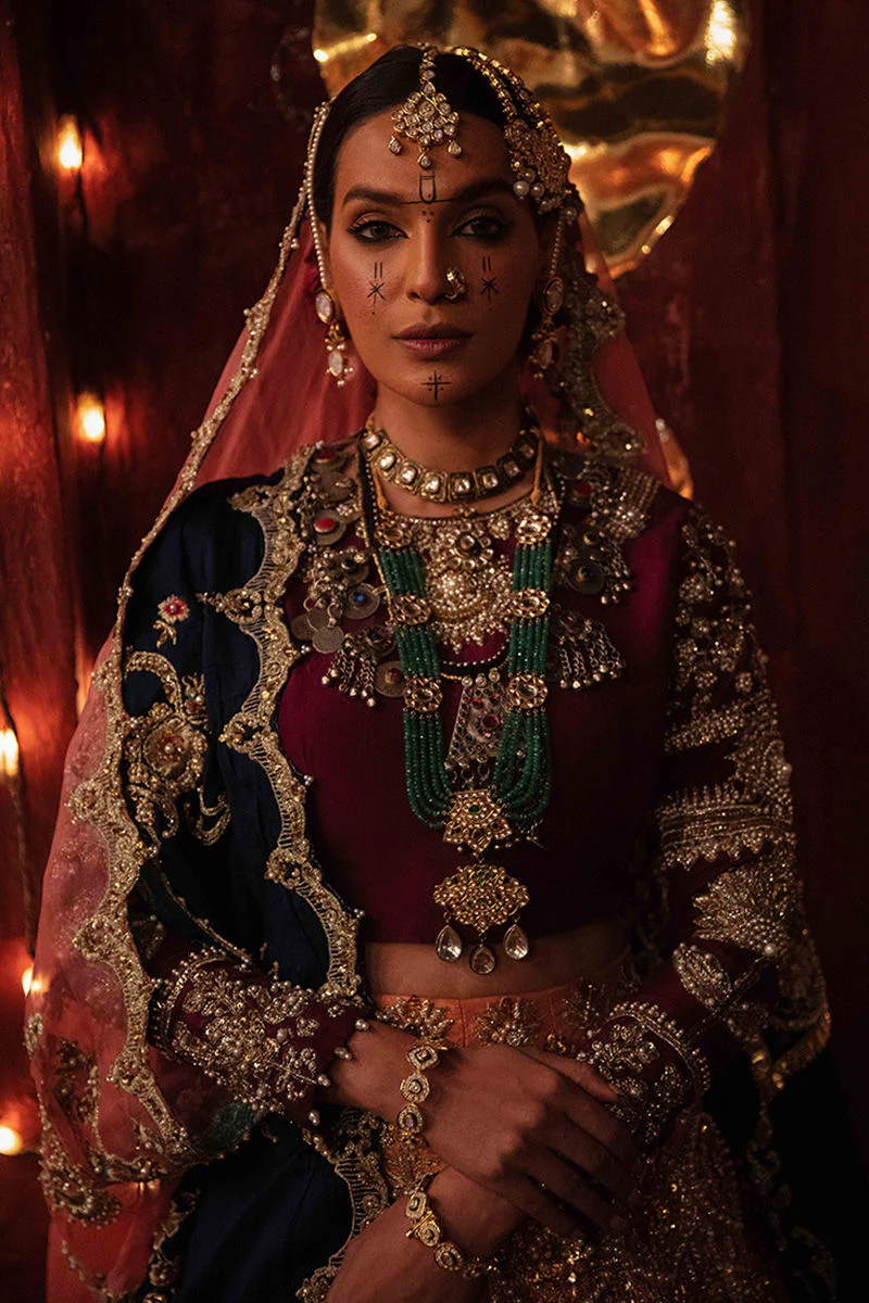 Rose pink lehenga with a plum choli and navy blue pallu dupatta, highlighted with gold and silver-toned embellishments.