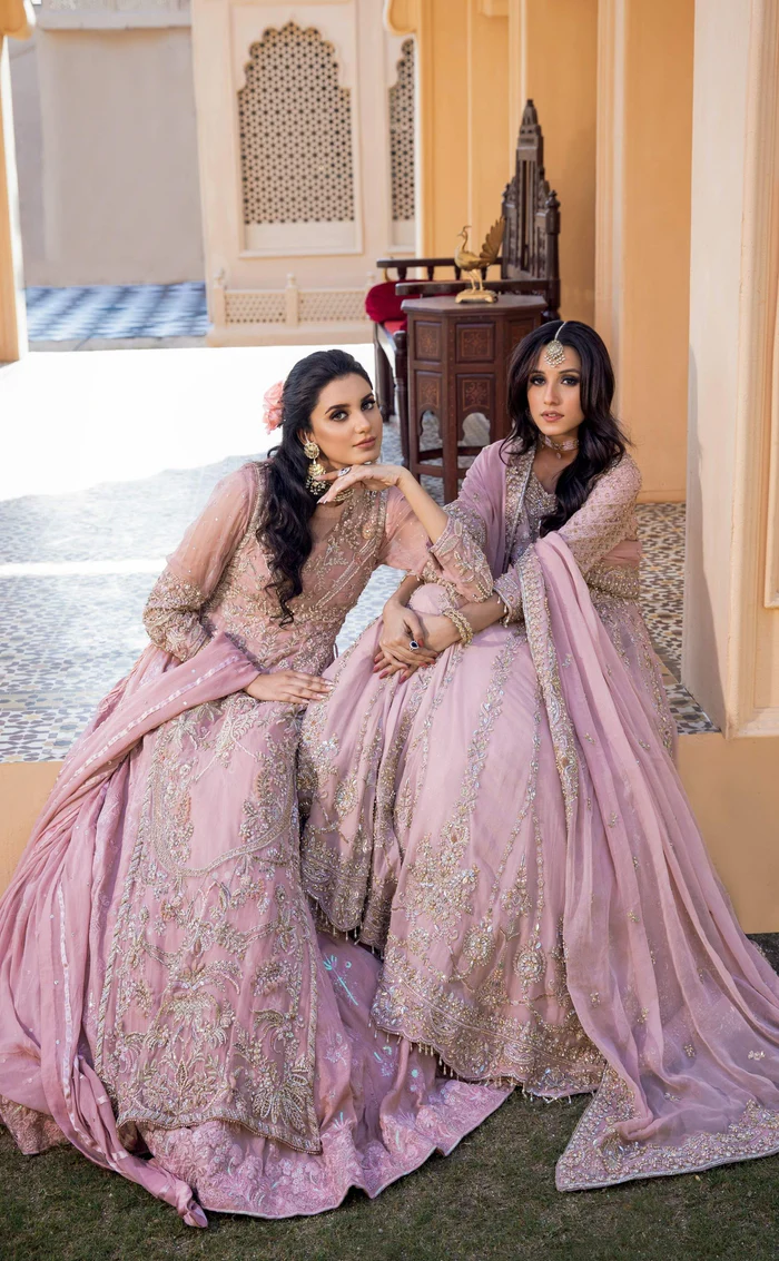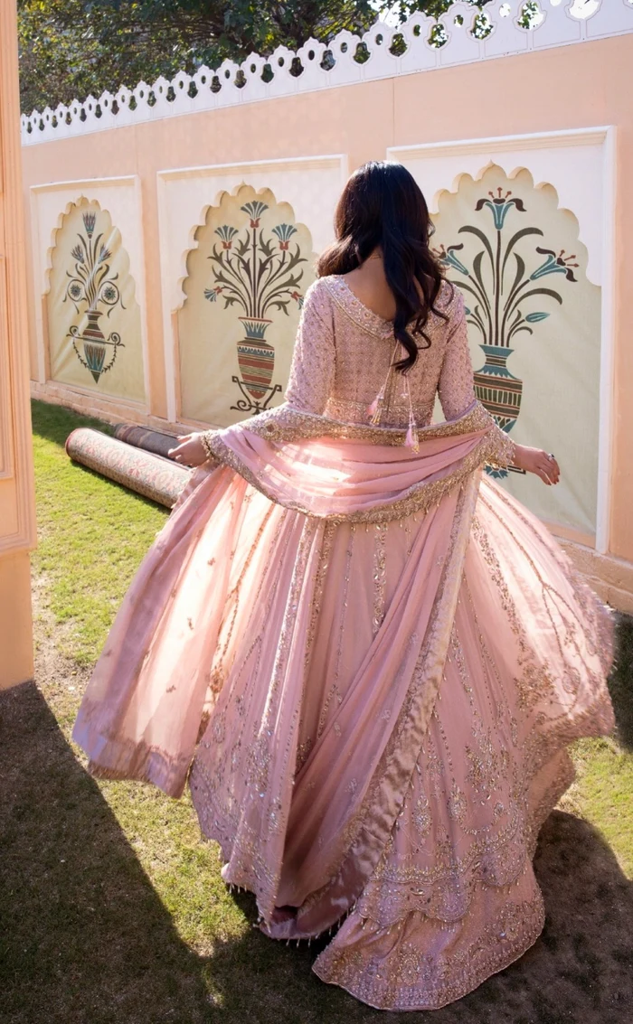 A dreamy pink chiffon maxi paired with an intricately embroidered lehnga and a delicately detailed dupatta, crafted to perfection for timeless elegance and bespoke comfort.