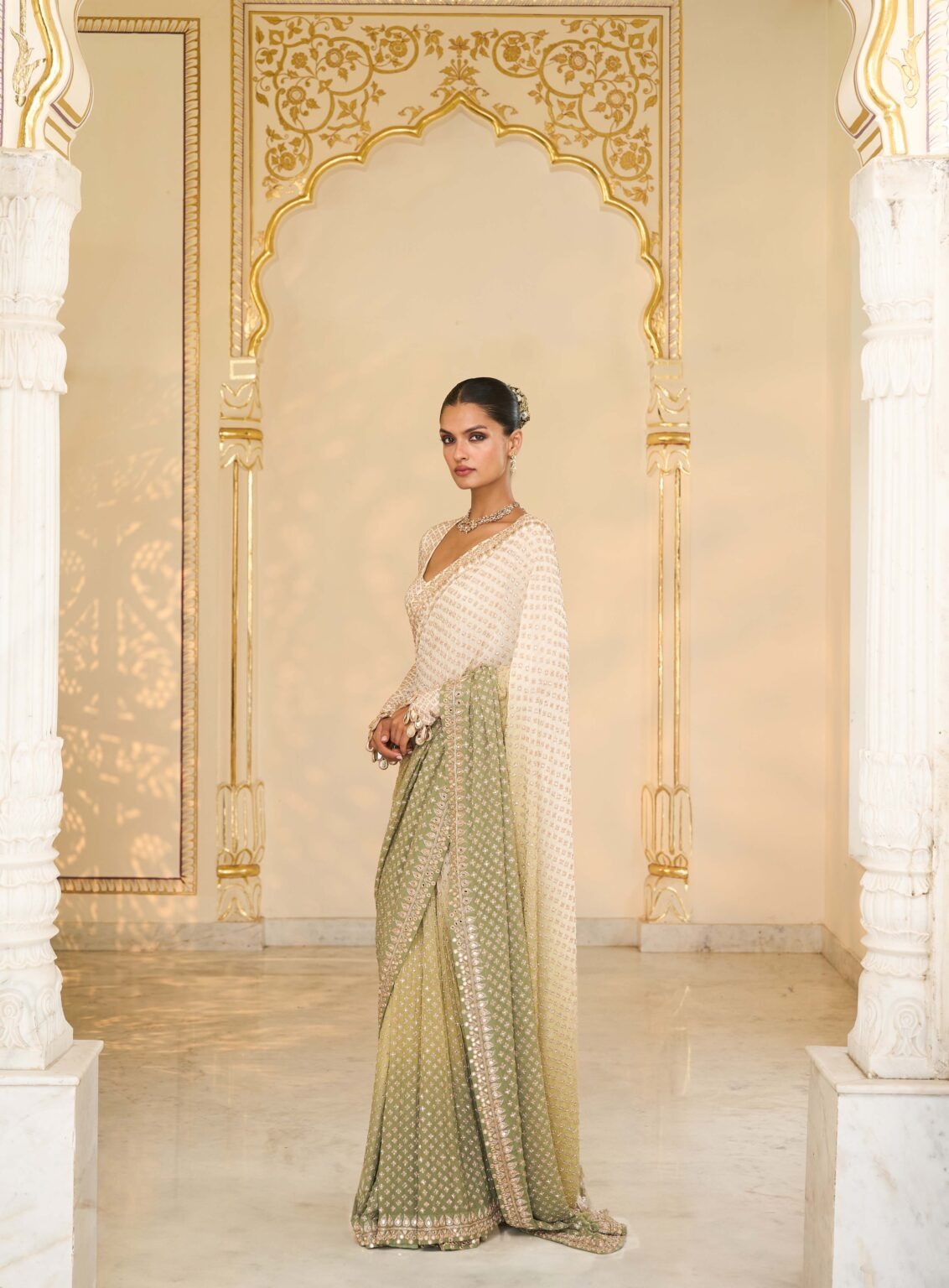 The sari features a soft blend of pink and coconut tones, designed to create a gentle gradient that enhances its elegance. Crafted from a premium draping fabric, it flows smoothly and maintains a refined structure. The handworked details bring delicate texture and shine, making it suitable for high-end events and celebrations.