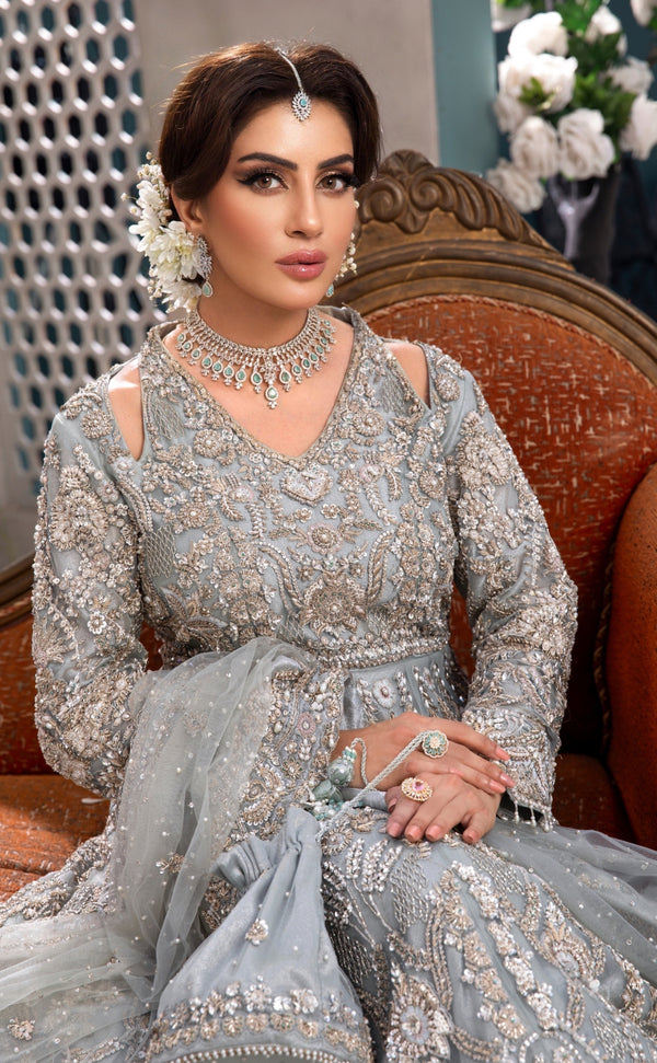 A soft blue satin long dress exquisitely embellished with hand-embroidered threadwork, Zardozi accents, and delicate net draping, paired with a matching embroidered dupatta for a regal bridal look.