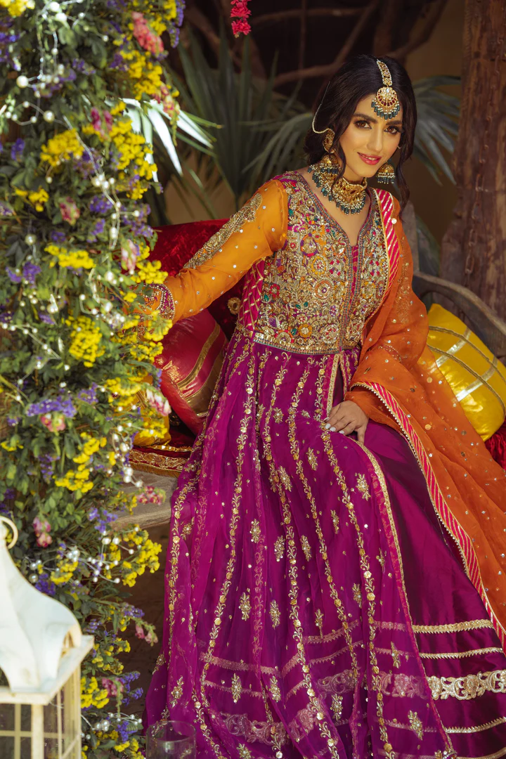 This regal purple bridal ensemble pairs a beautifully embellished open pishwas with a luxurious silk lehenga and an organza dupatta. Rich gota, tilla, floral motifs, and handcrafted details come together to create the perfect traditional look for your Mehndi or bridal celebration.